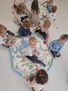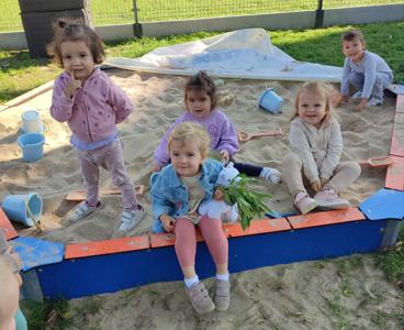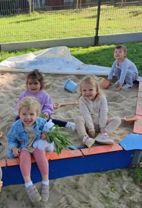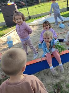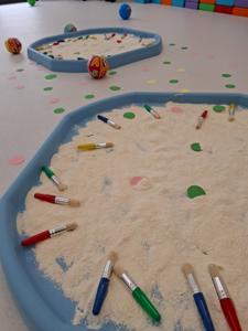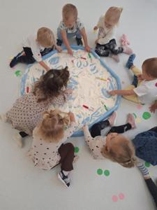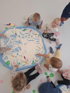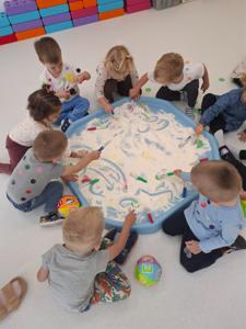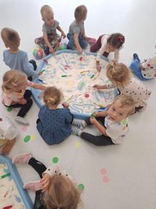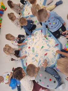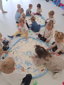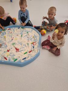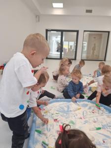 używając pędzelków. Zabawa sprawiła im mnóstwo radości, a przy okazji rozwija zmysł dotyku,