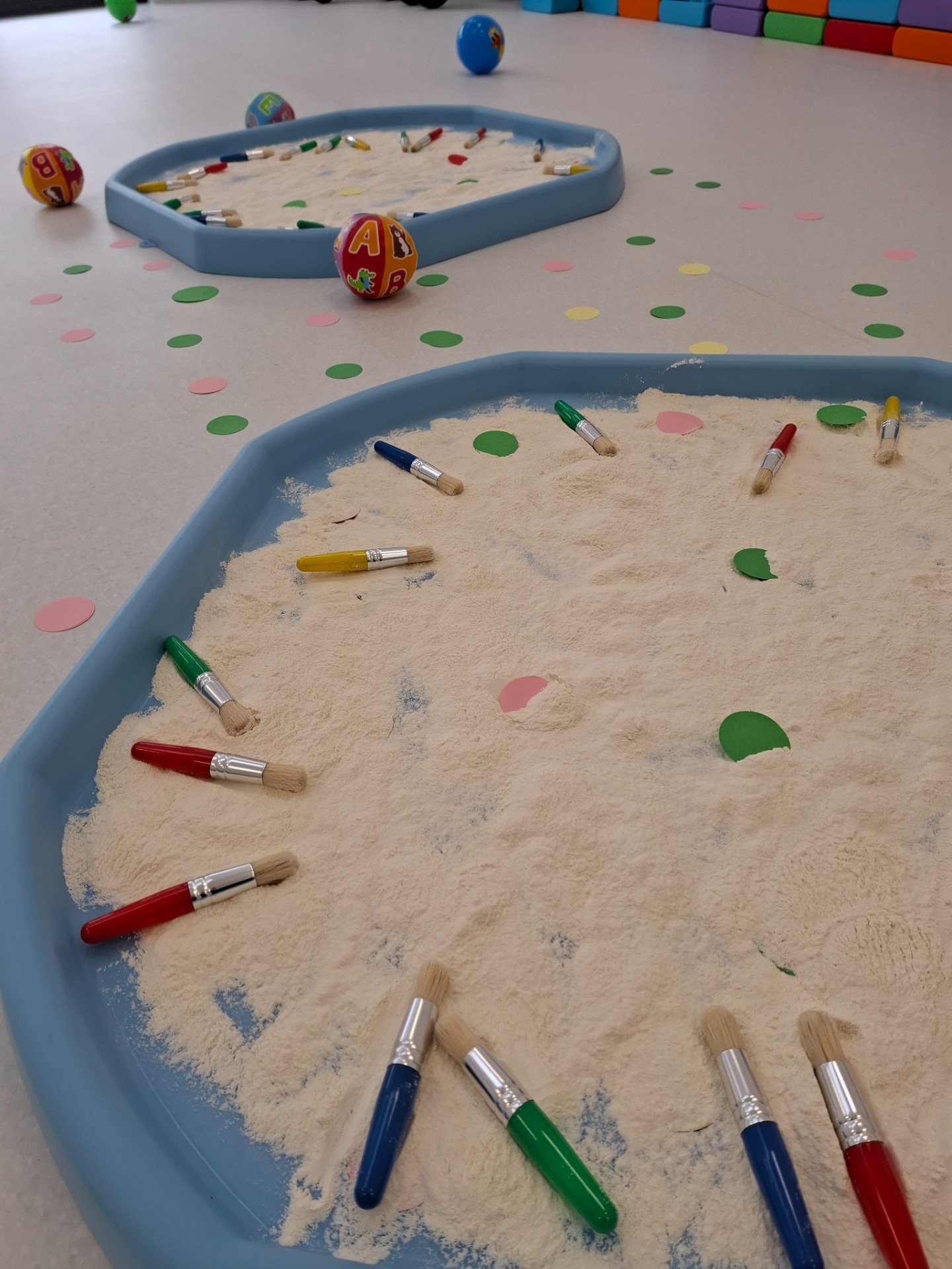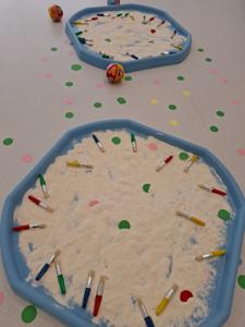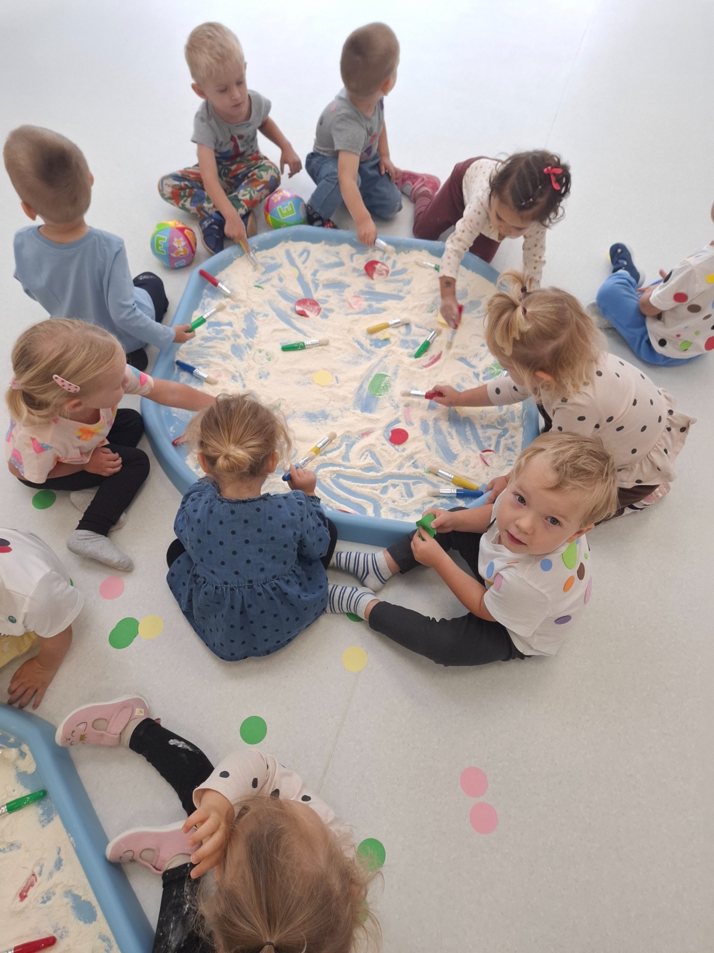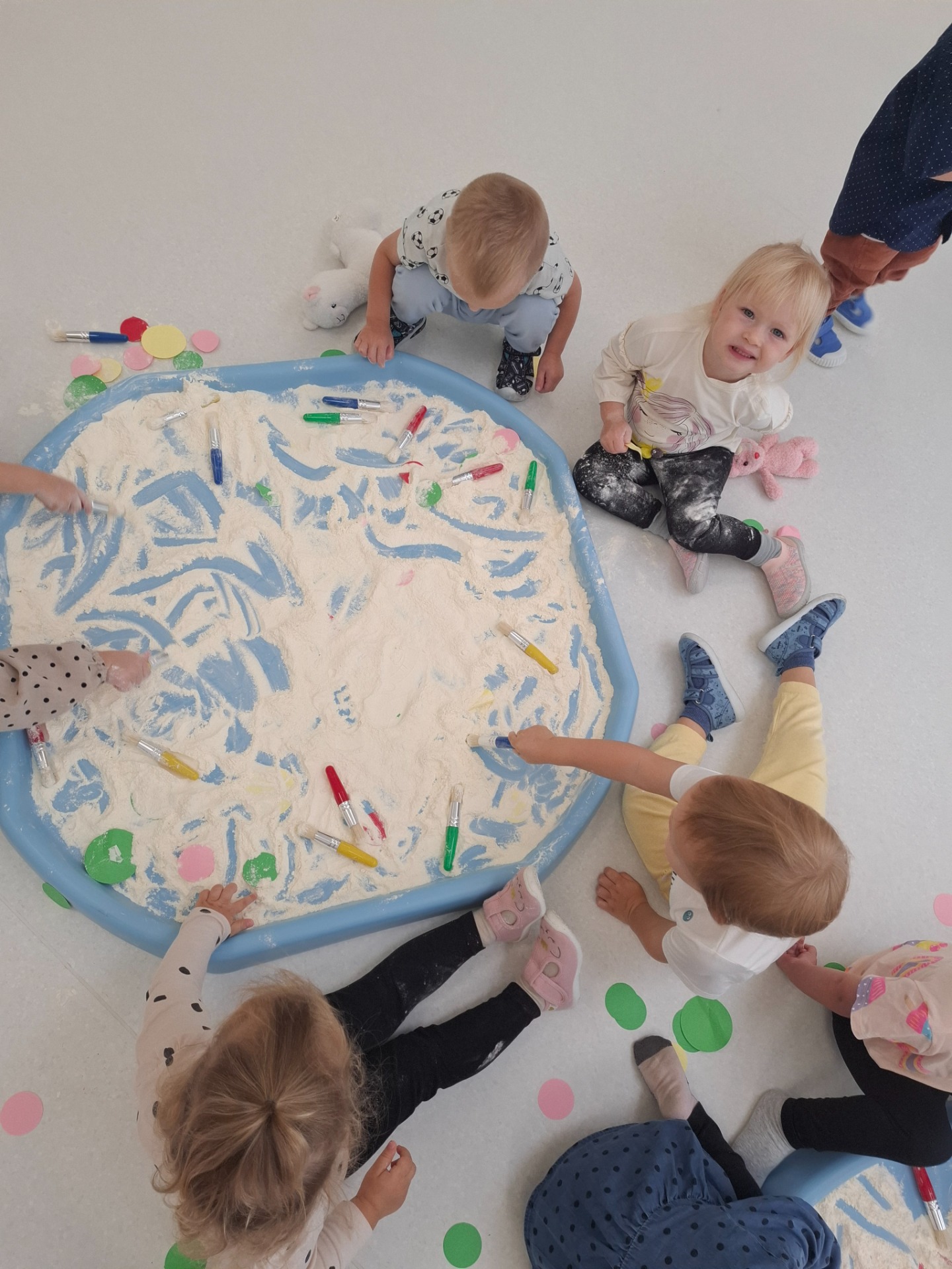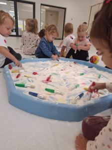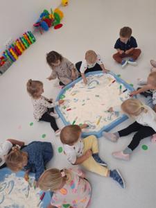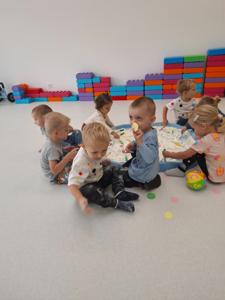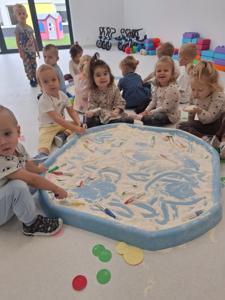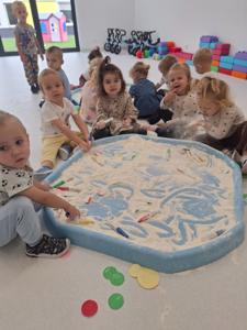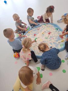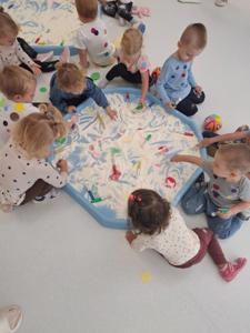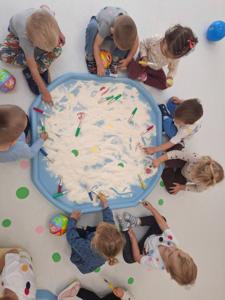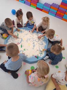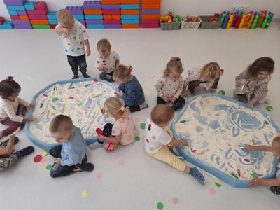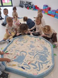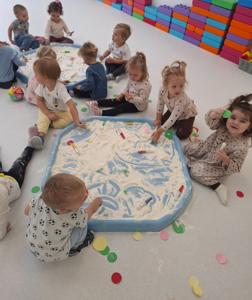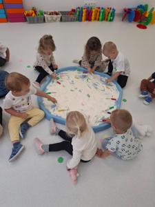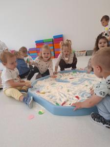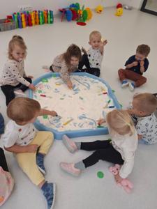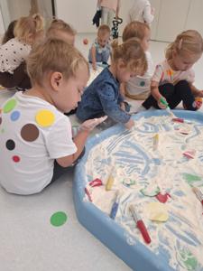 Dzieci z ogromnym zaangażowaniem szukały ukrytych kropek w mące,