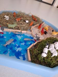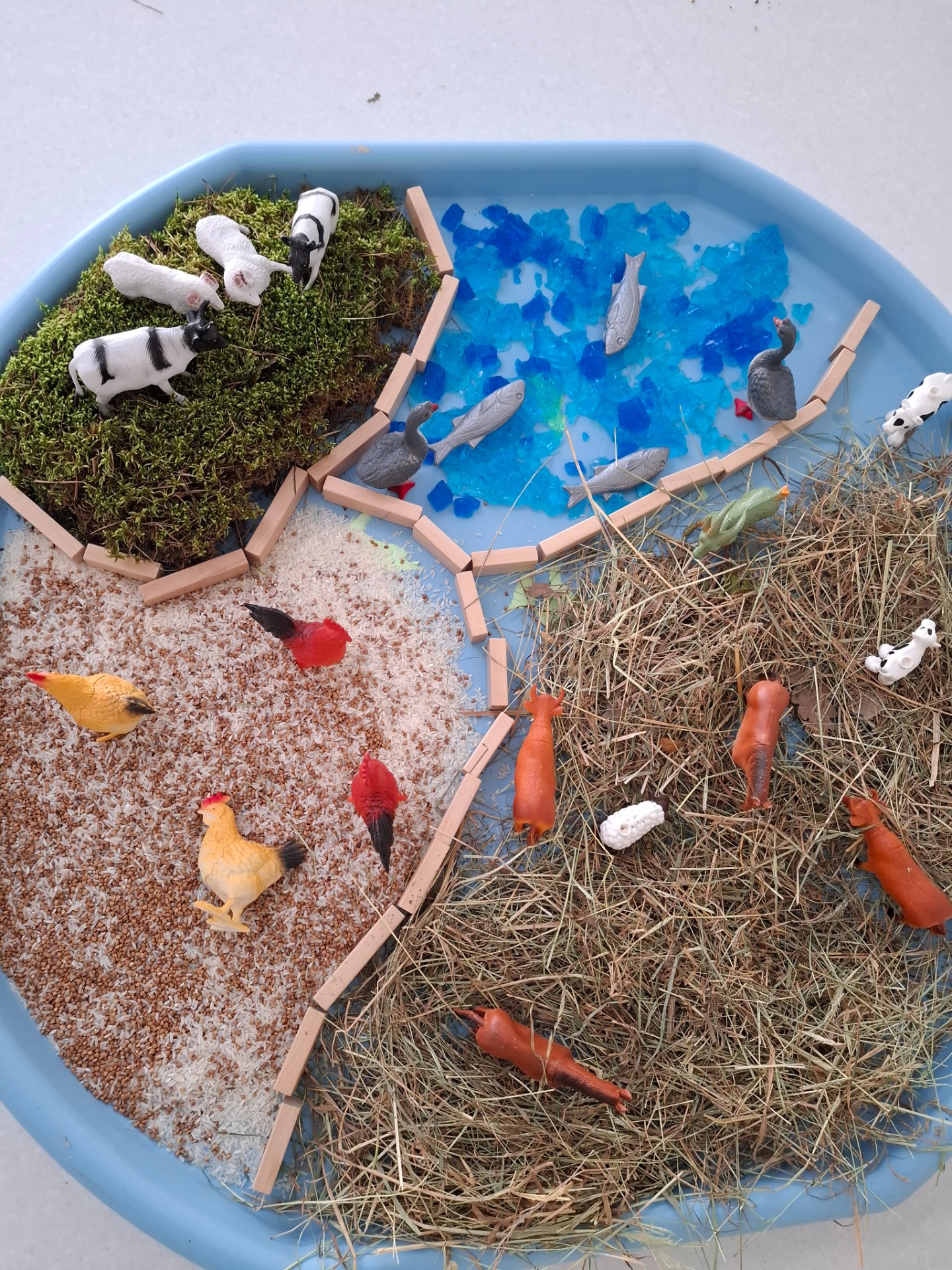 Na dużej tacy zostały umieszczone figurki zwierząt: konie🐎, krowy🐄, owce🐑, gęsi i kury🐔.