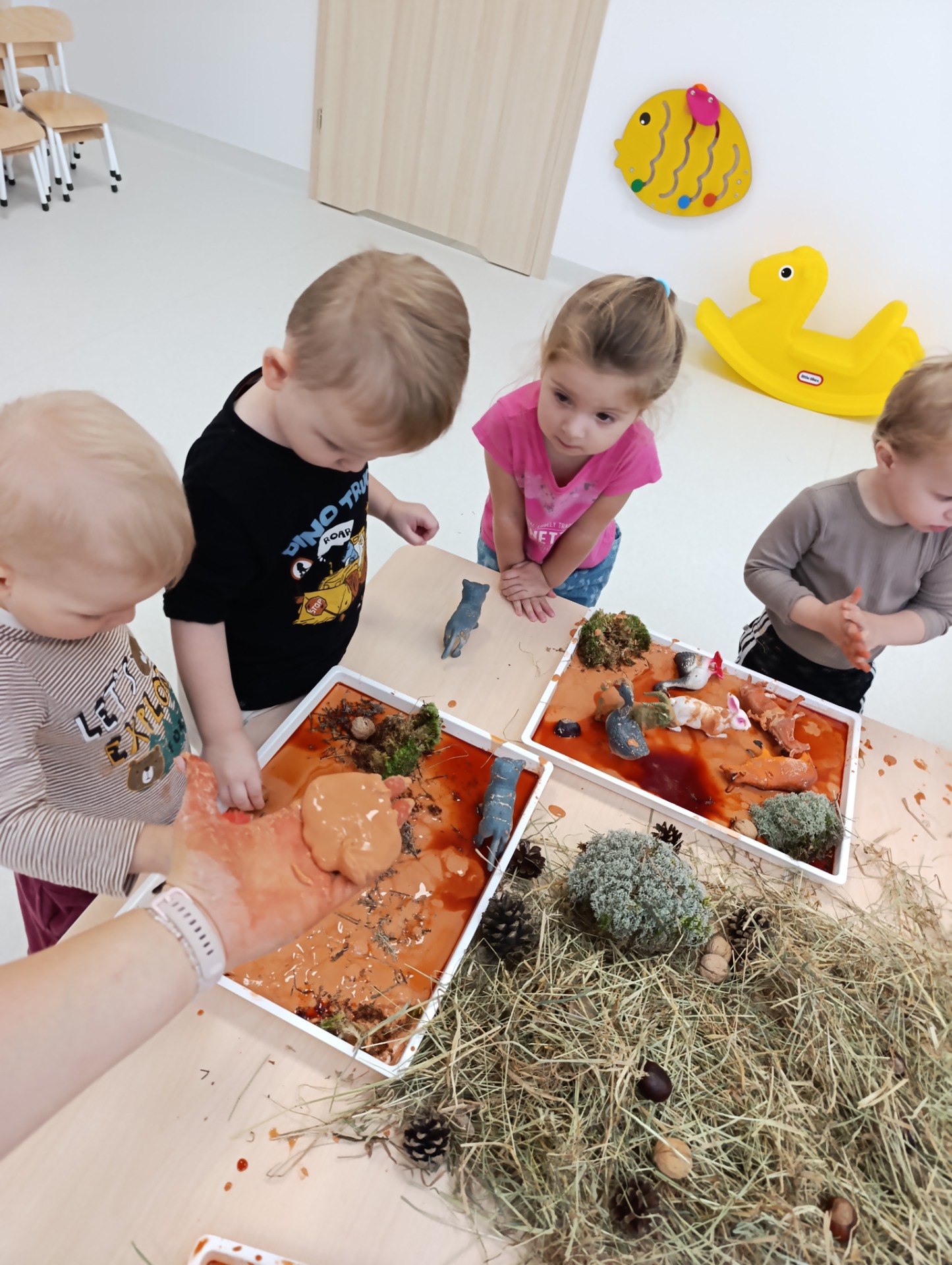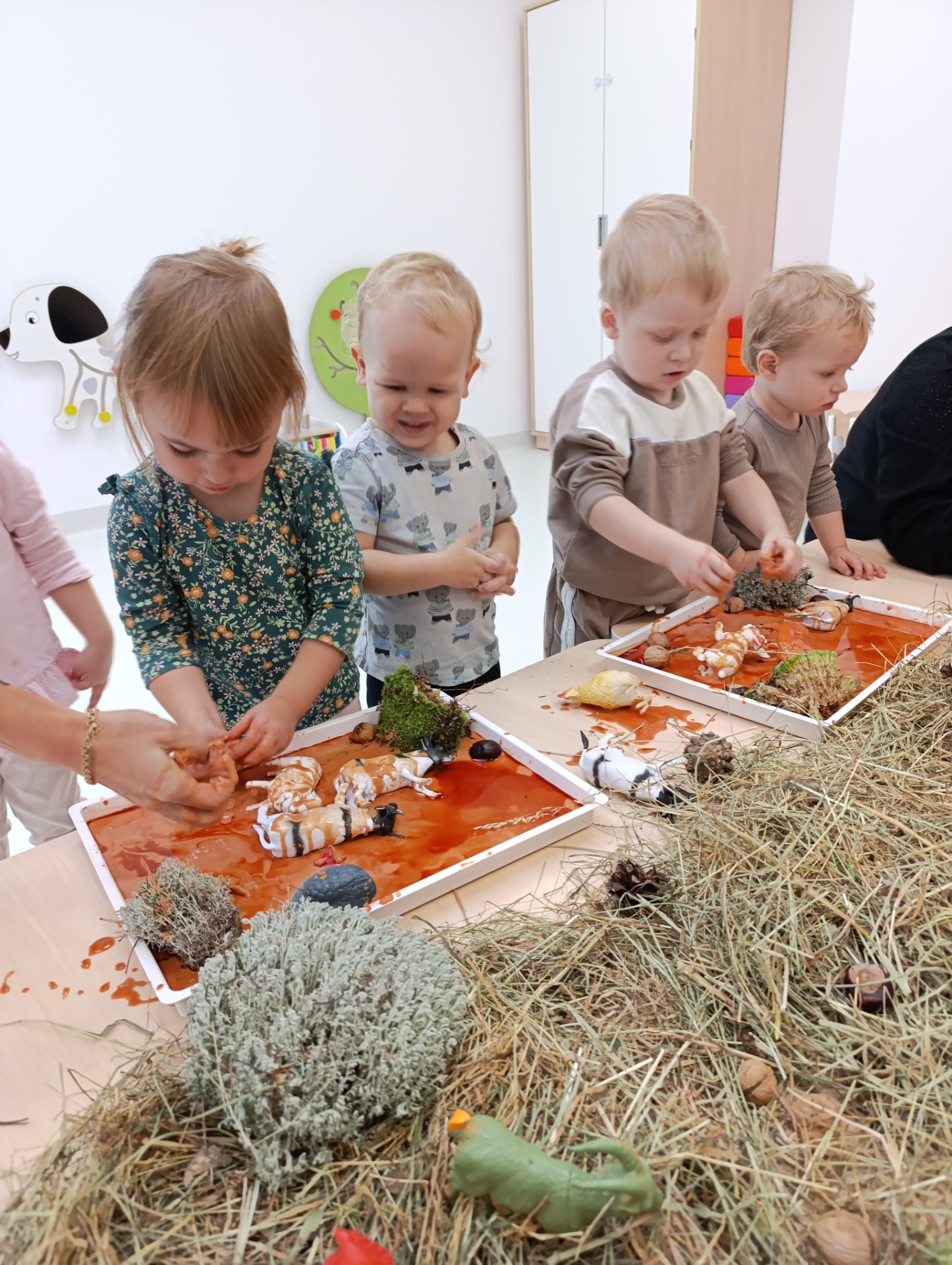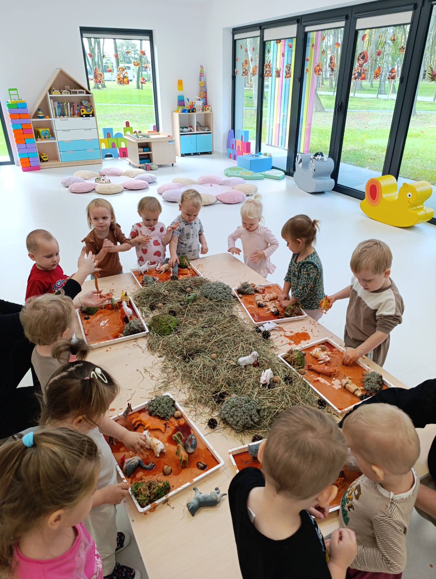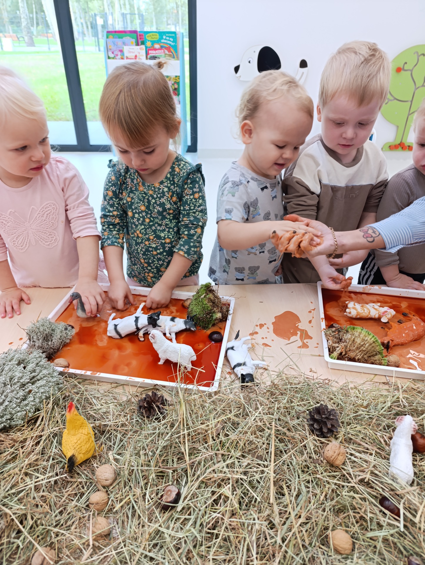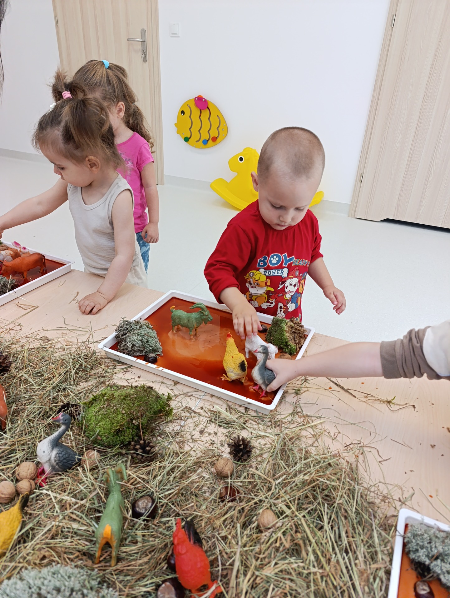 Dzieci z ogromną radością zanurzały w niej swoje ulubione figurki zwierząt 🐄🐖🐇🐑 doskonaląc ćwiczenia