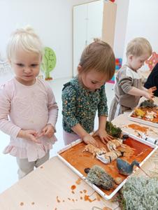 Na zajęciach przygotowaliśmy "błotko" z maki ziemniaczanej, wody i odrobiny barwnika spożywczego.