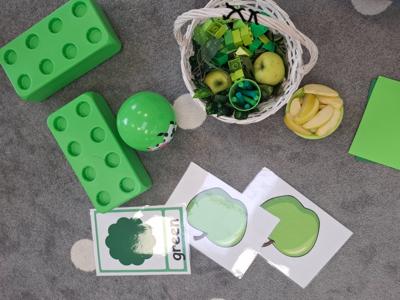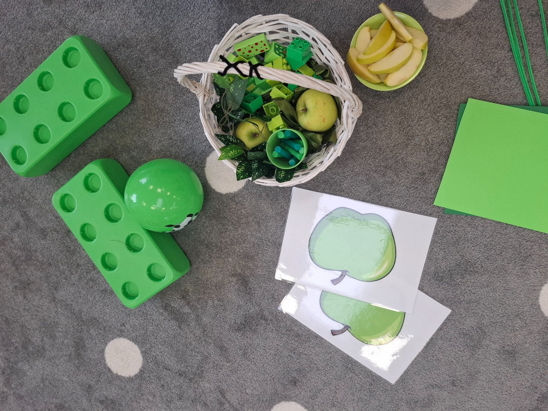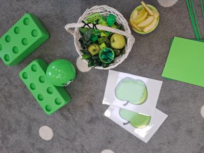 kolor GREEN.💚🍏🥬🟢🟩 Na dywanie przygotowano różne zielone przedmioty -