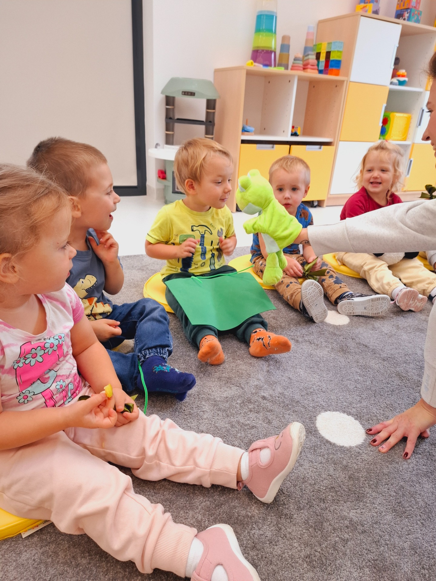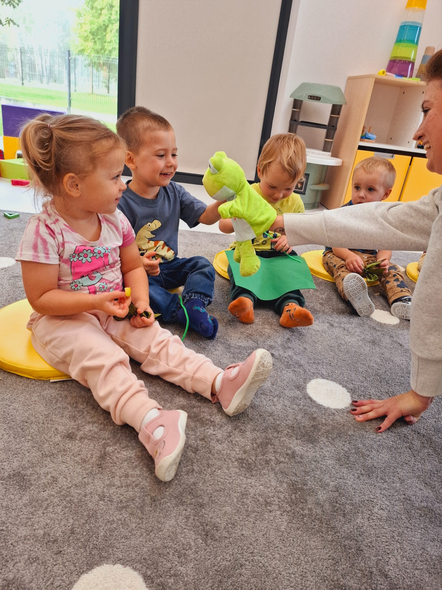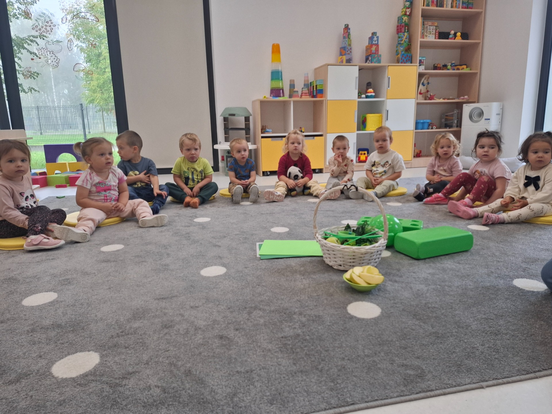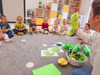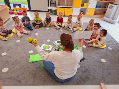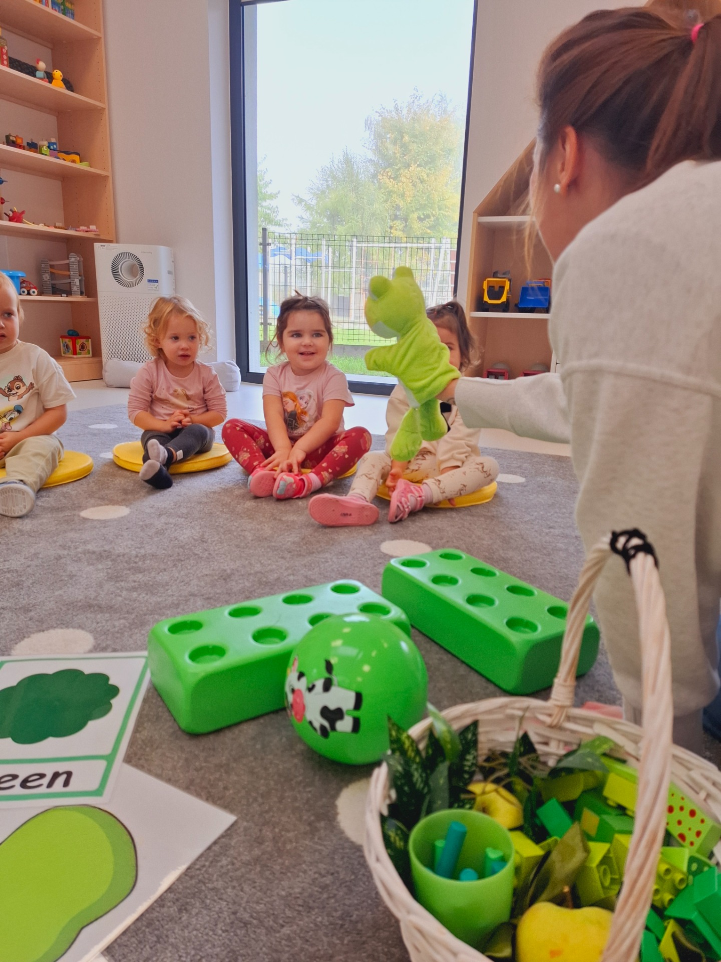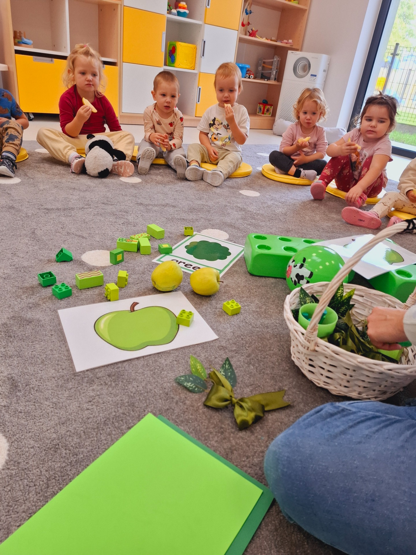 Maluchy z zainteresowaniem uczestniczyły w zabawie i powtarzały słowo GREEN.🍏🟢🍏🟢🍏