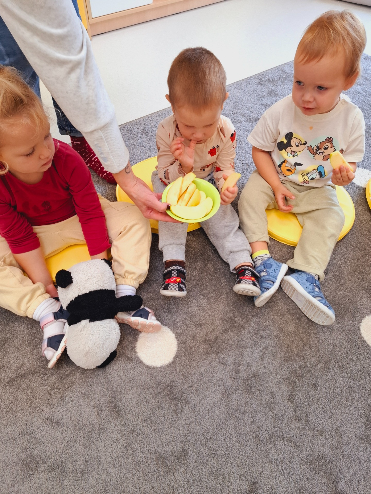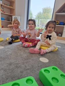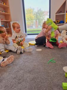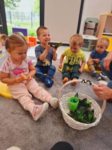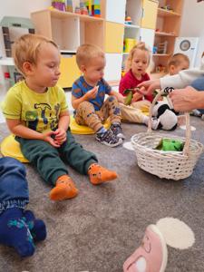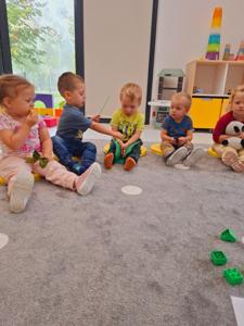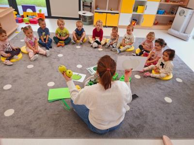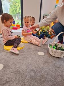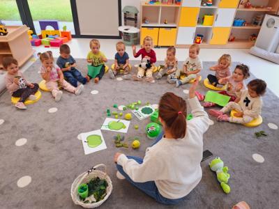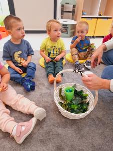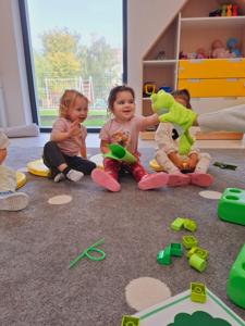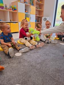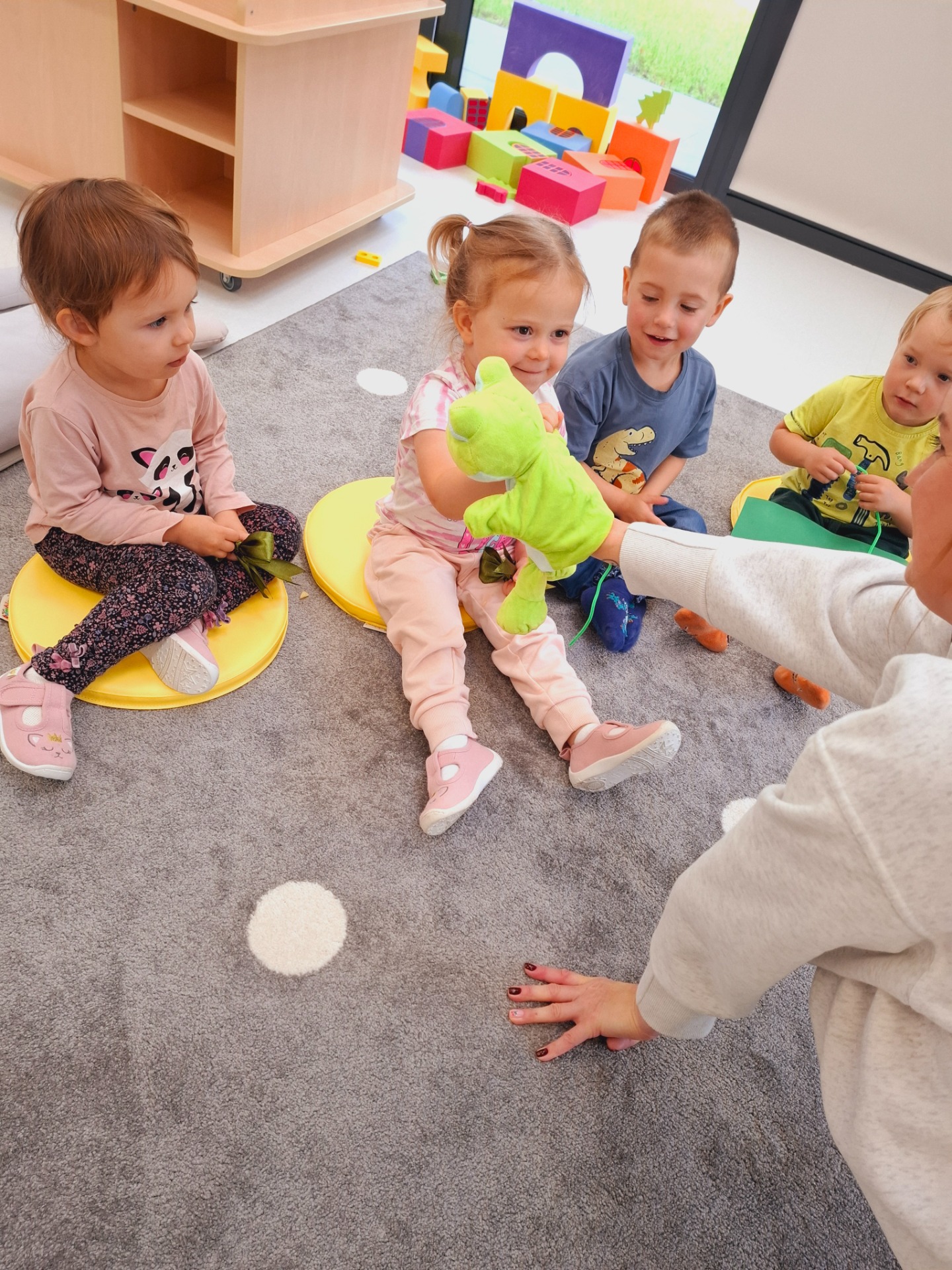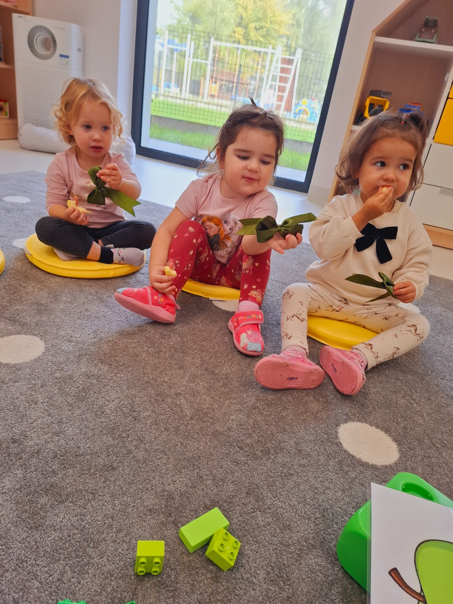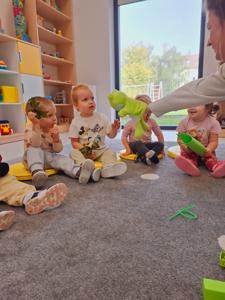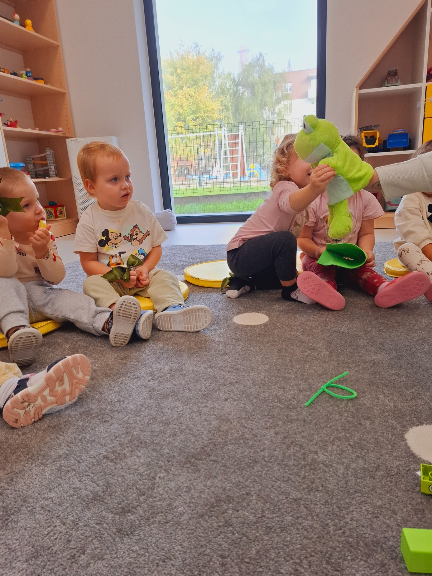 Maluchy z zainteresowaniem uczestniczyły w zabawie i powtarzały słowo GREEN.🍏🟢🍏🟢🍏