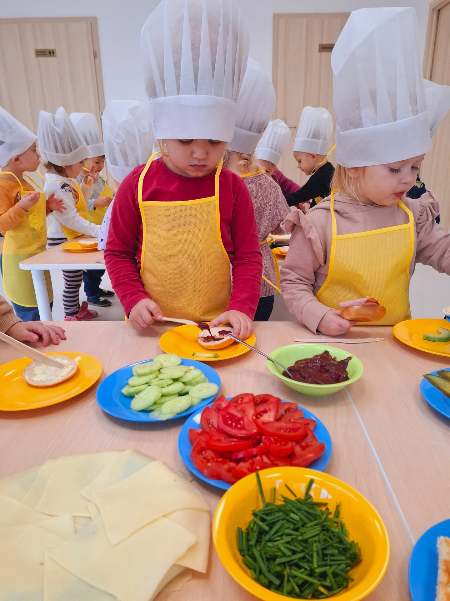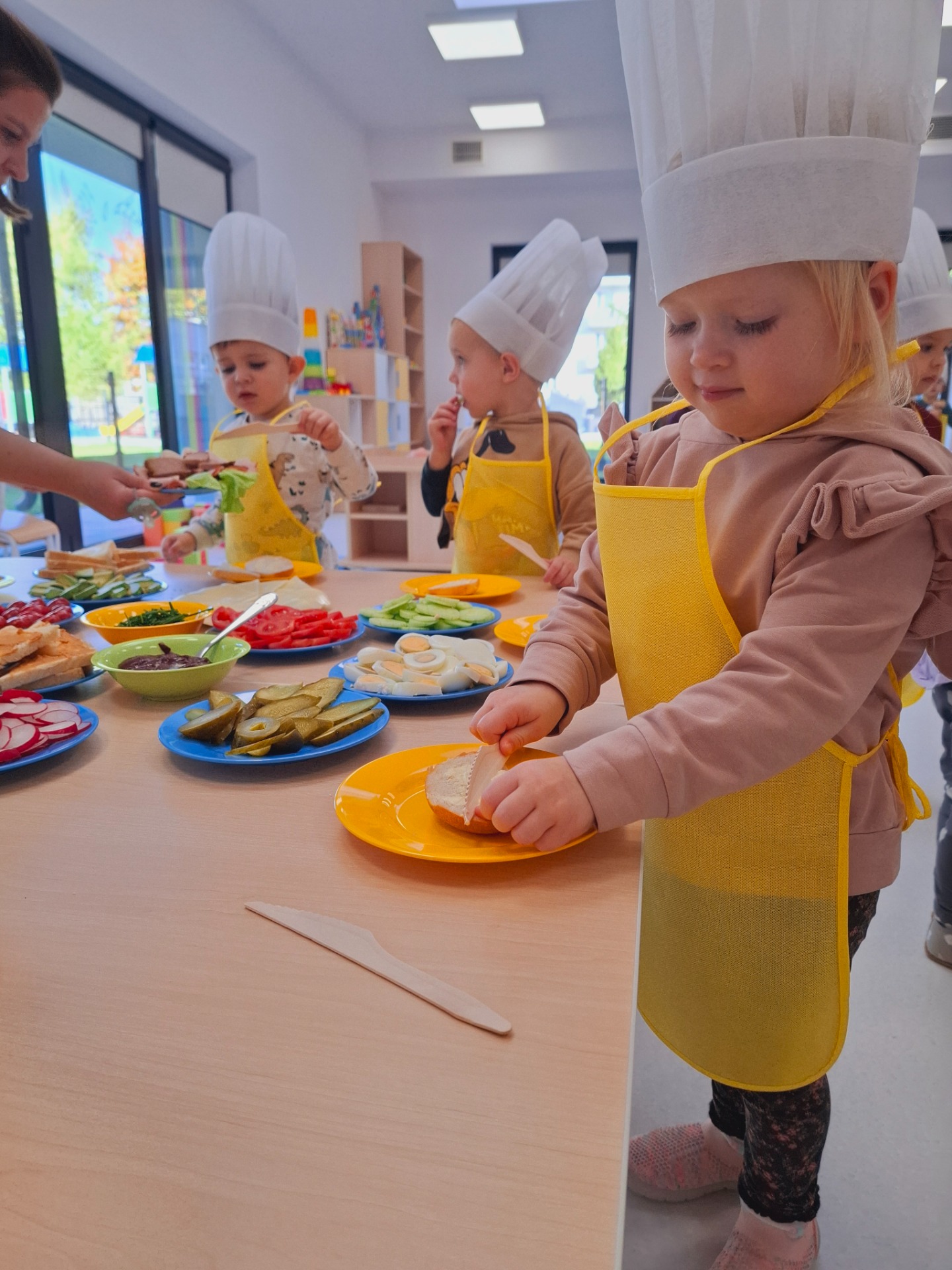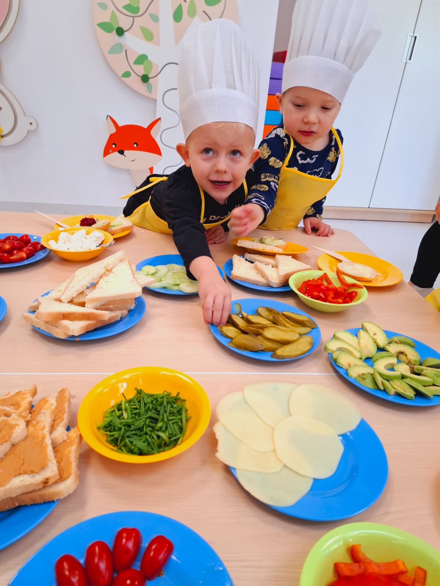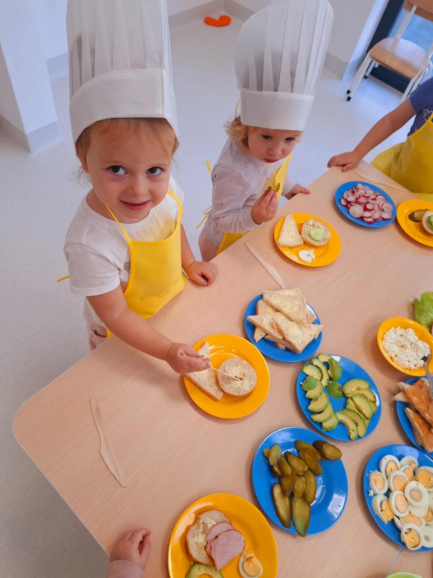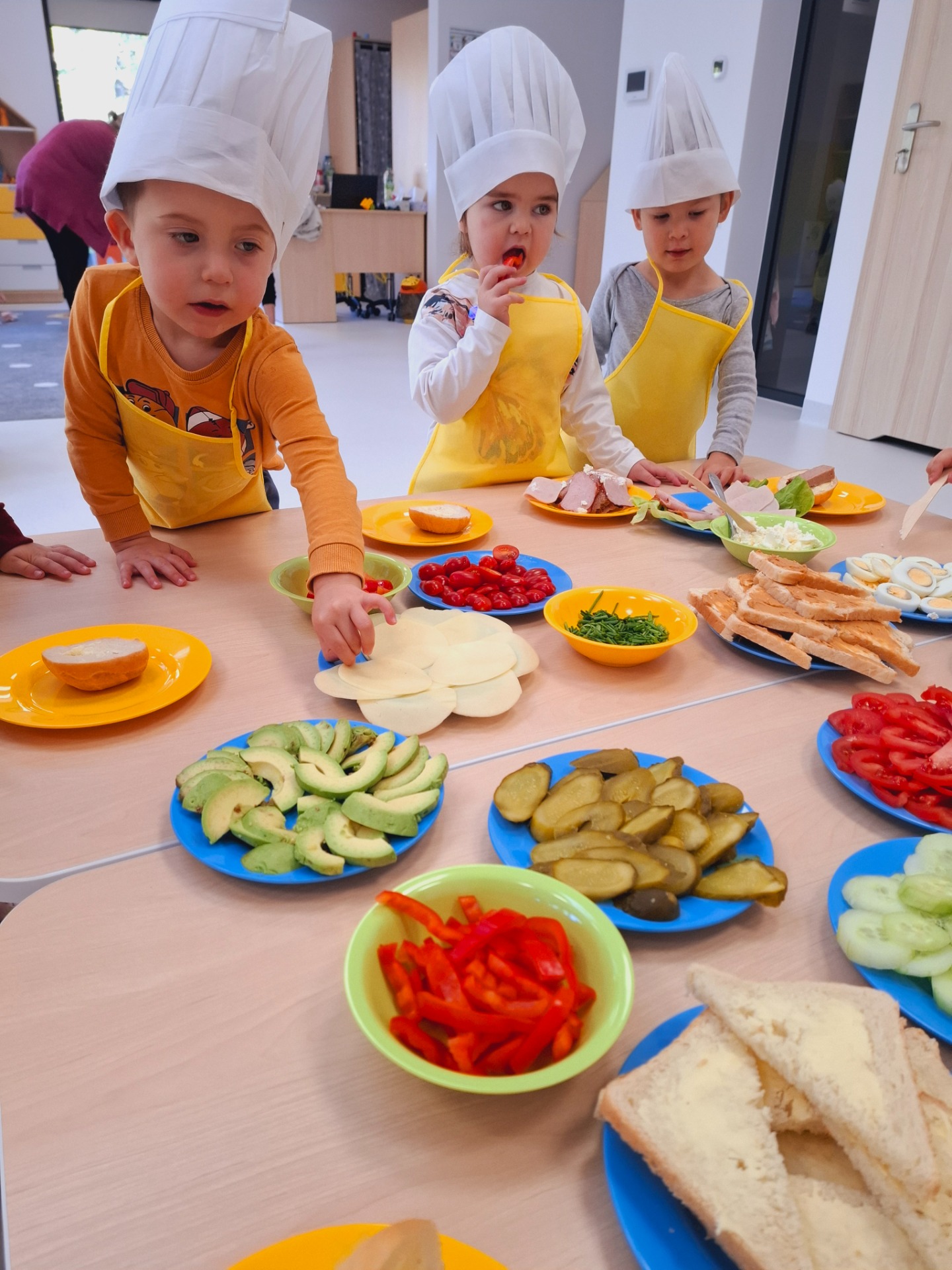 W specjalnych czapkach i fartuszkach kucharskich dzieci samodzielnie przygotowywały kolorowe i zdrowe kanapki. 🥪🥪🥪