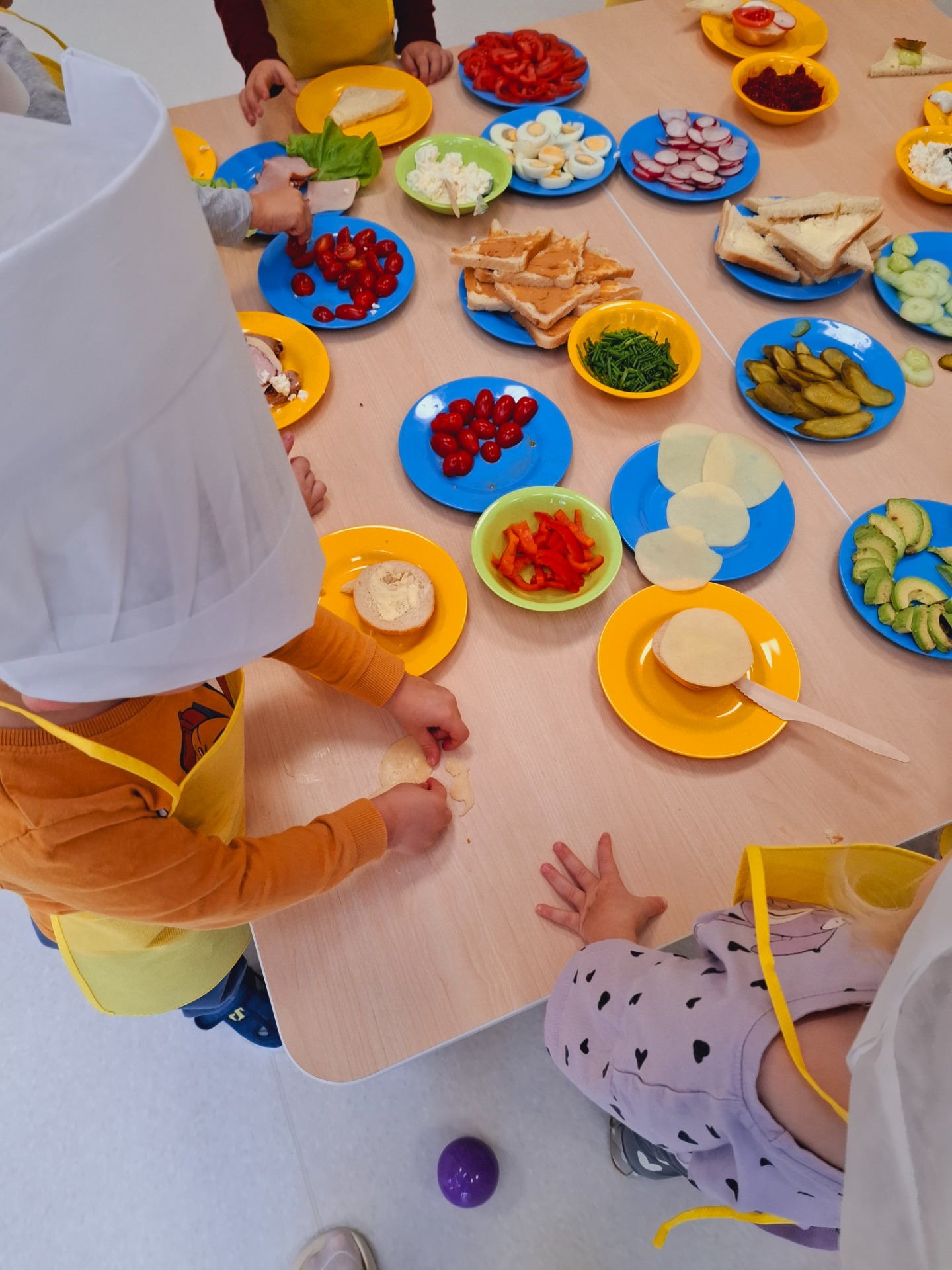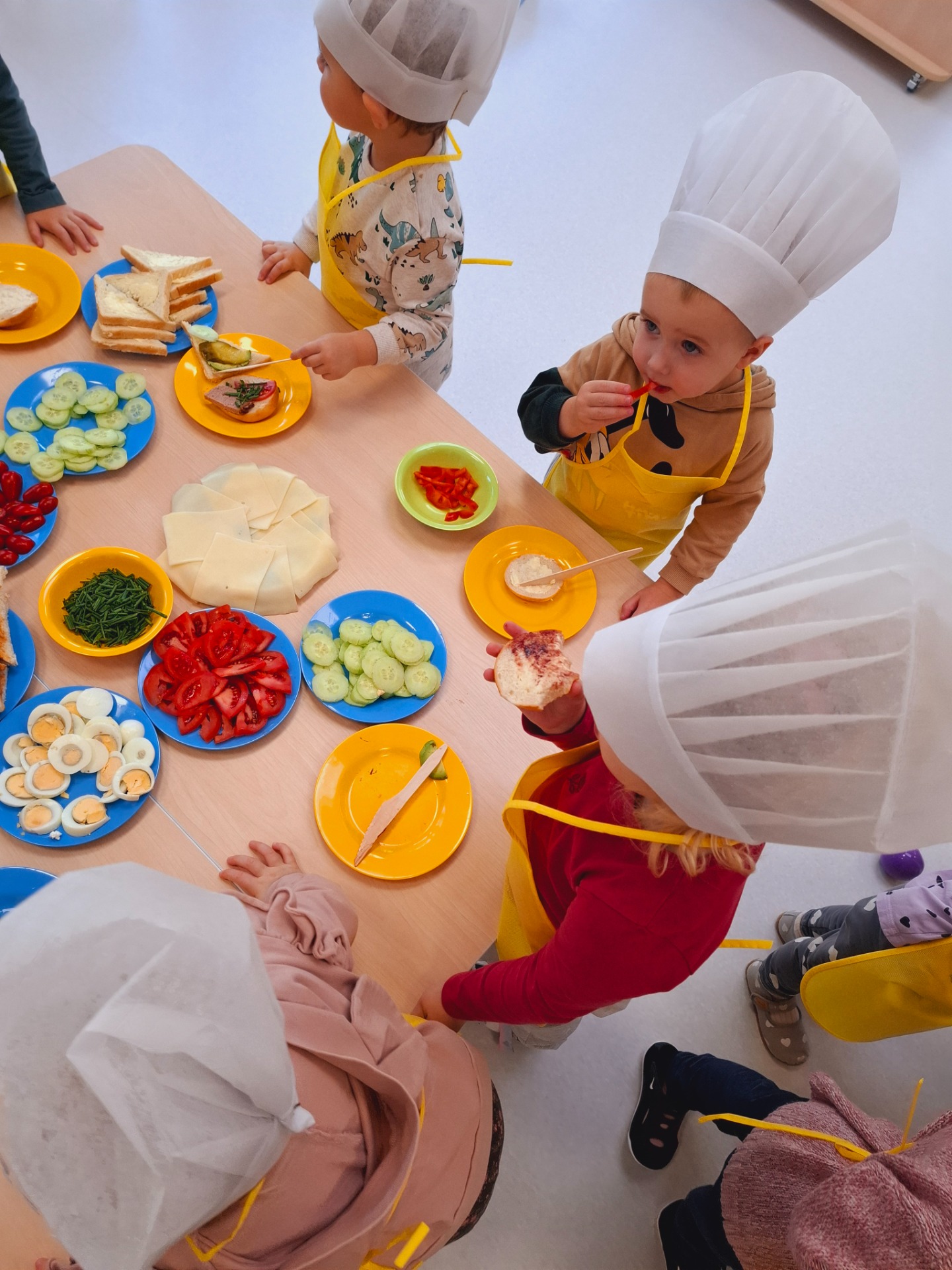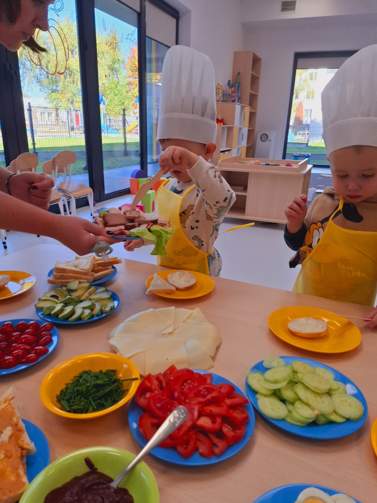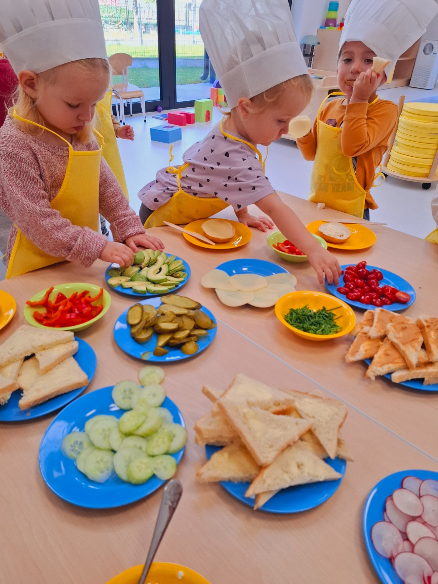 W specjalnych czapkach i fartuszkach kucharskich dzieci samodzielnie przygotowywały kolorowe i zdrowe kanapki. 🥪🥪🥪