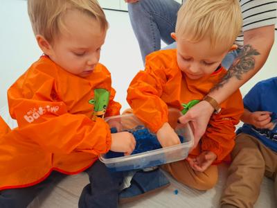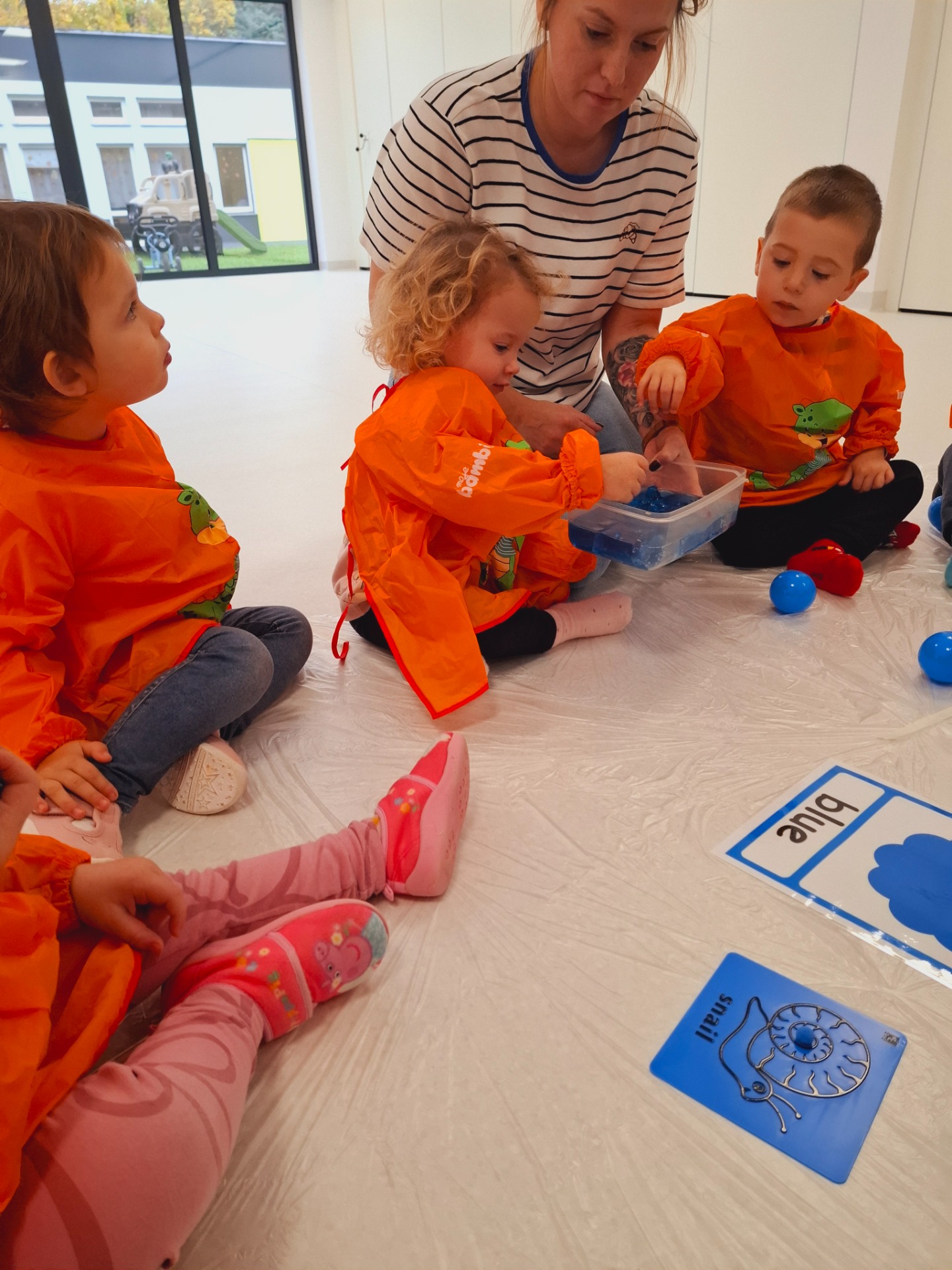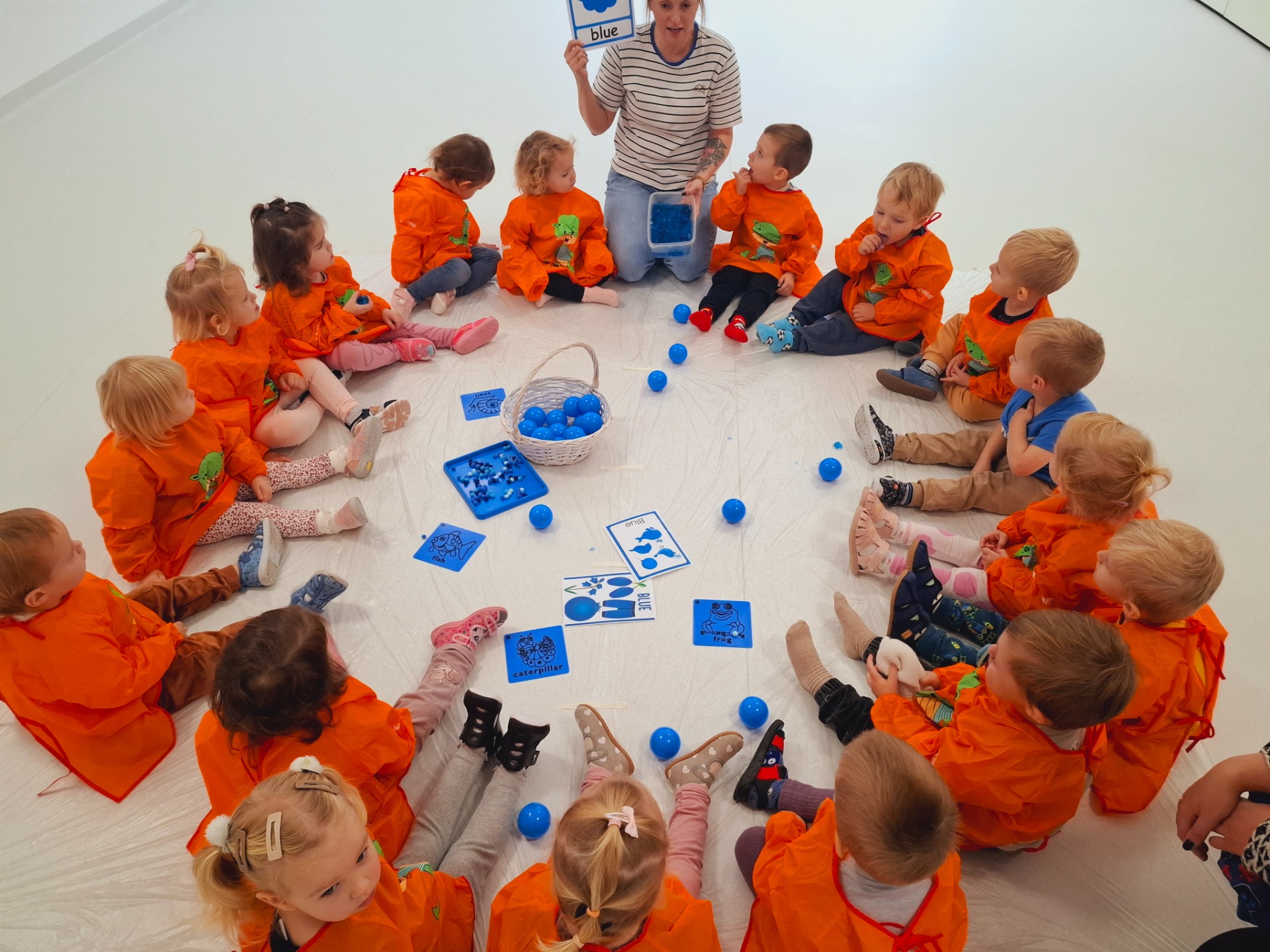Na początku zajęć wspólnie poznawaliśmy słówko BLUE🔵💙🔹🔷🟦 wskazując na niebieskie przedmioty z koszyka.
