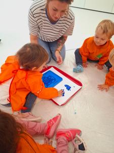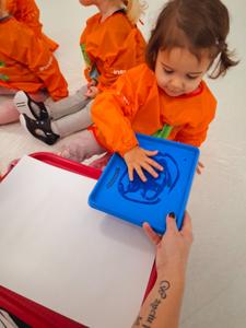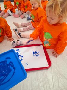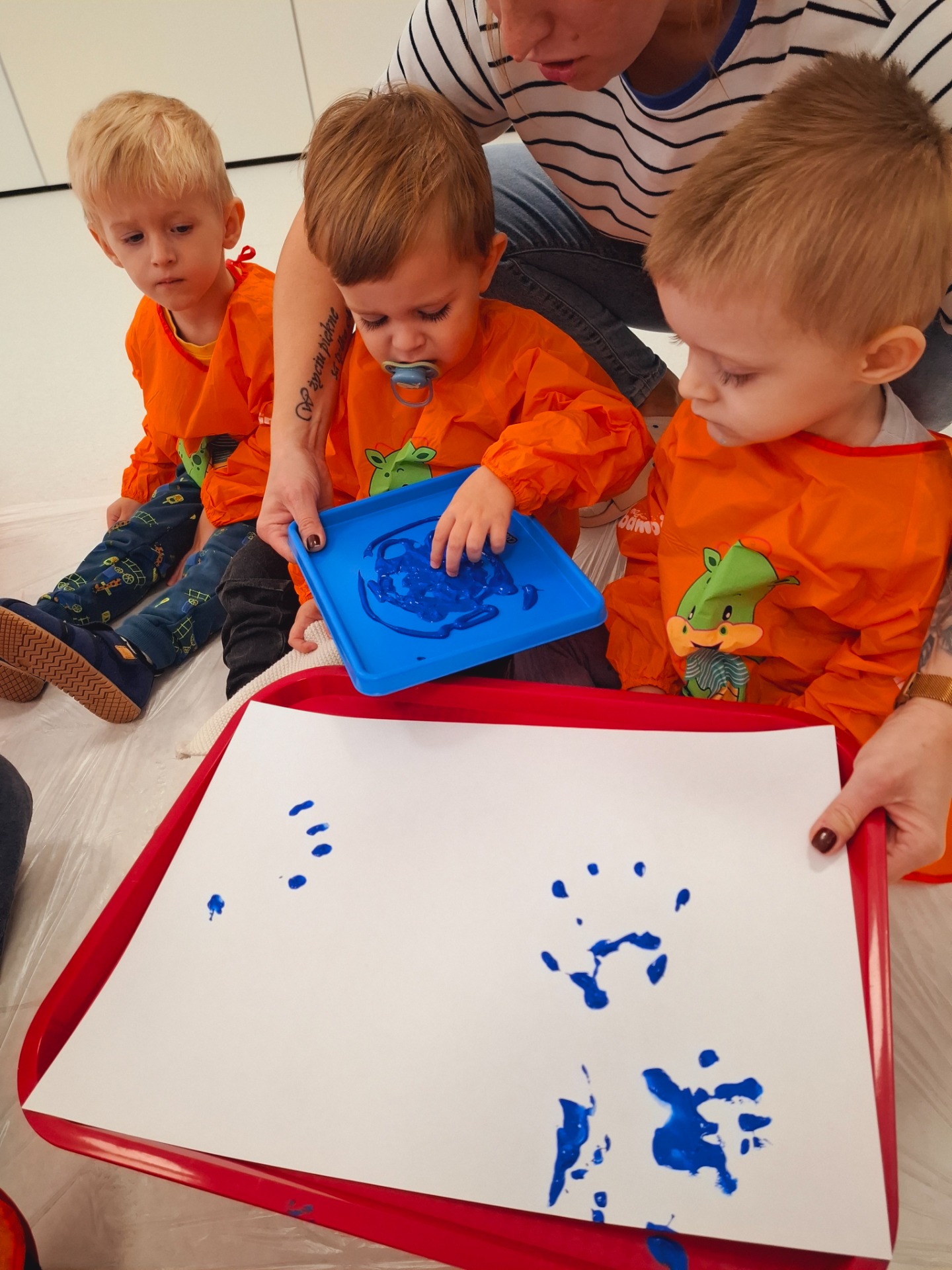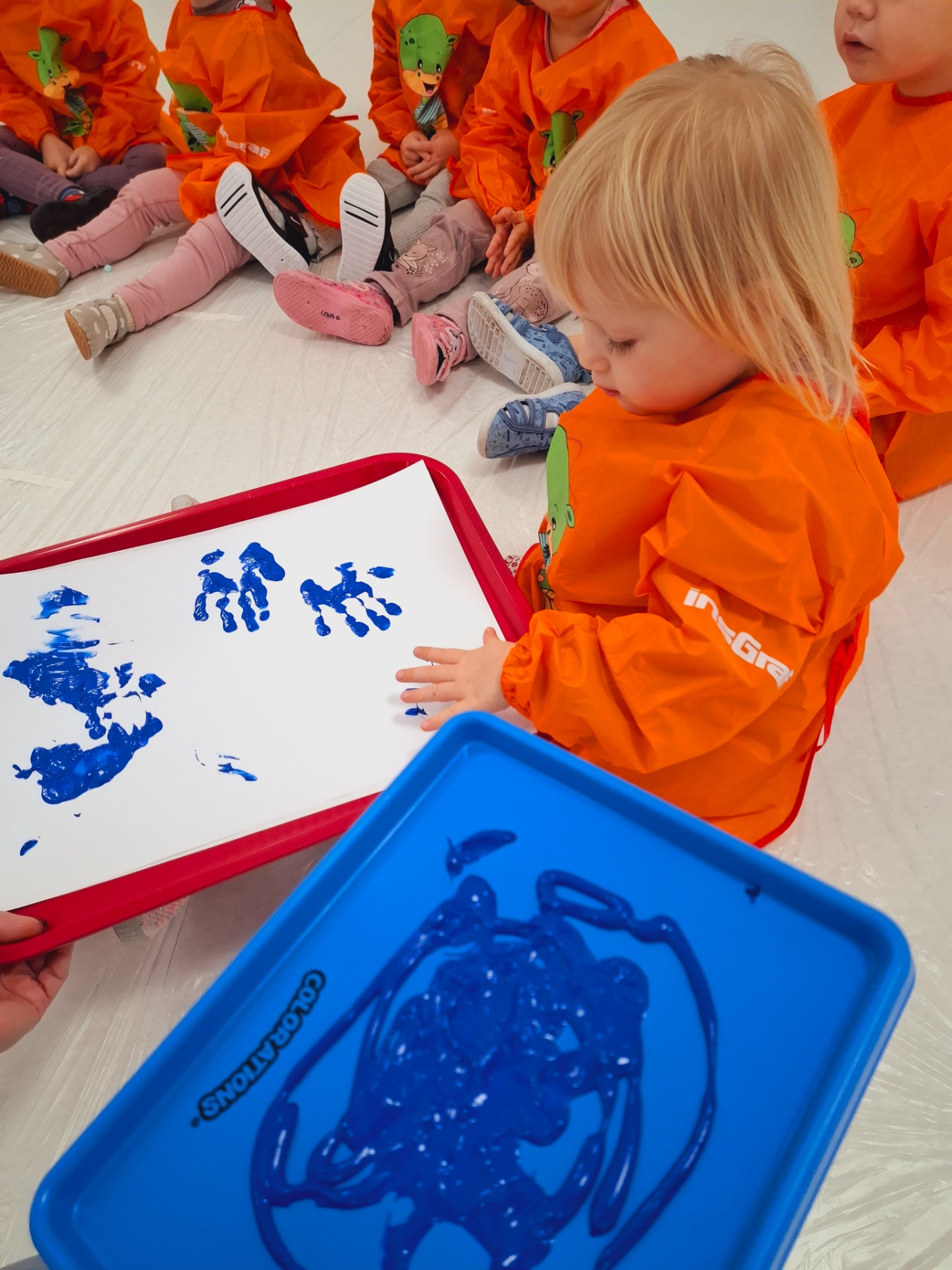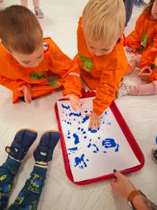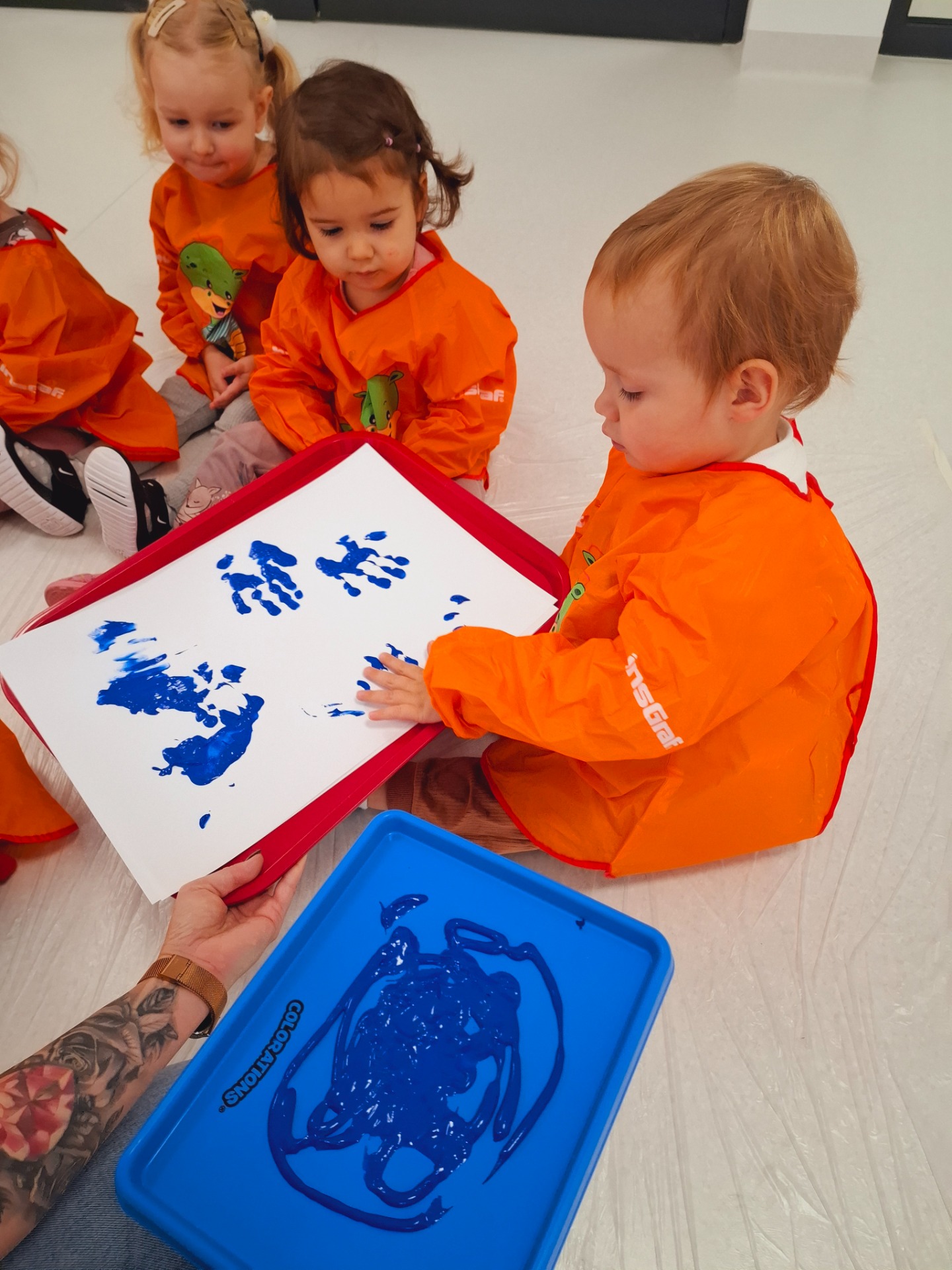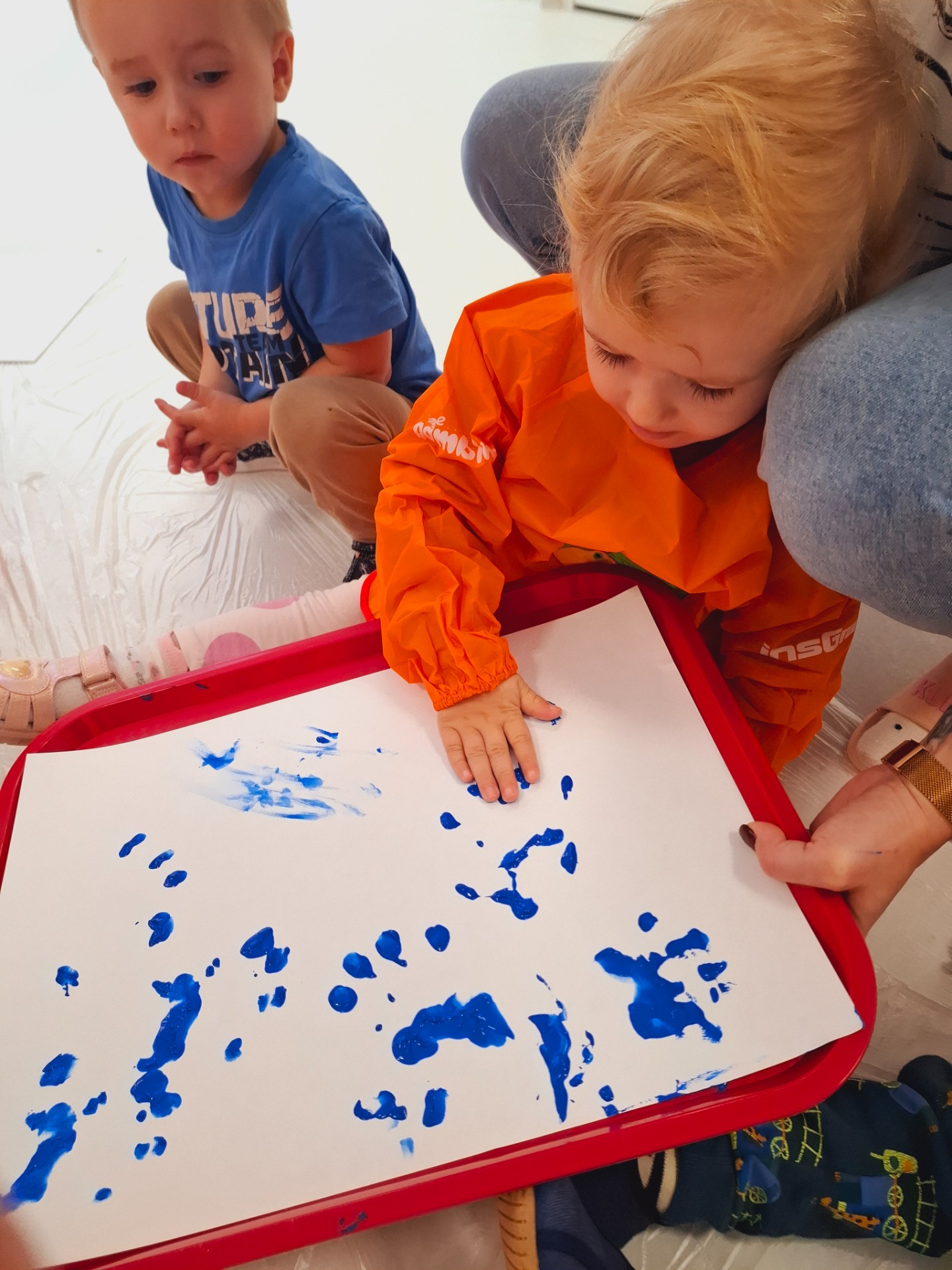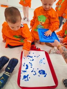 W drugiej części zajęć dzieci robiły odcisk swoich dłoni w niebieskiej farbie na białych kartkach.