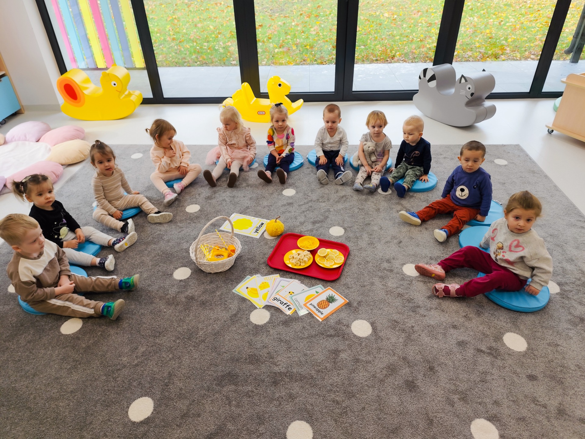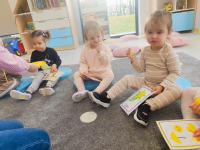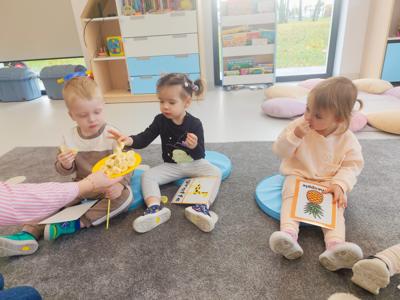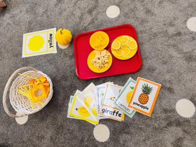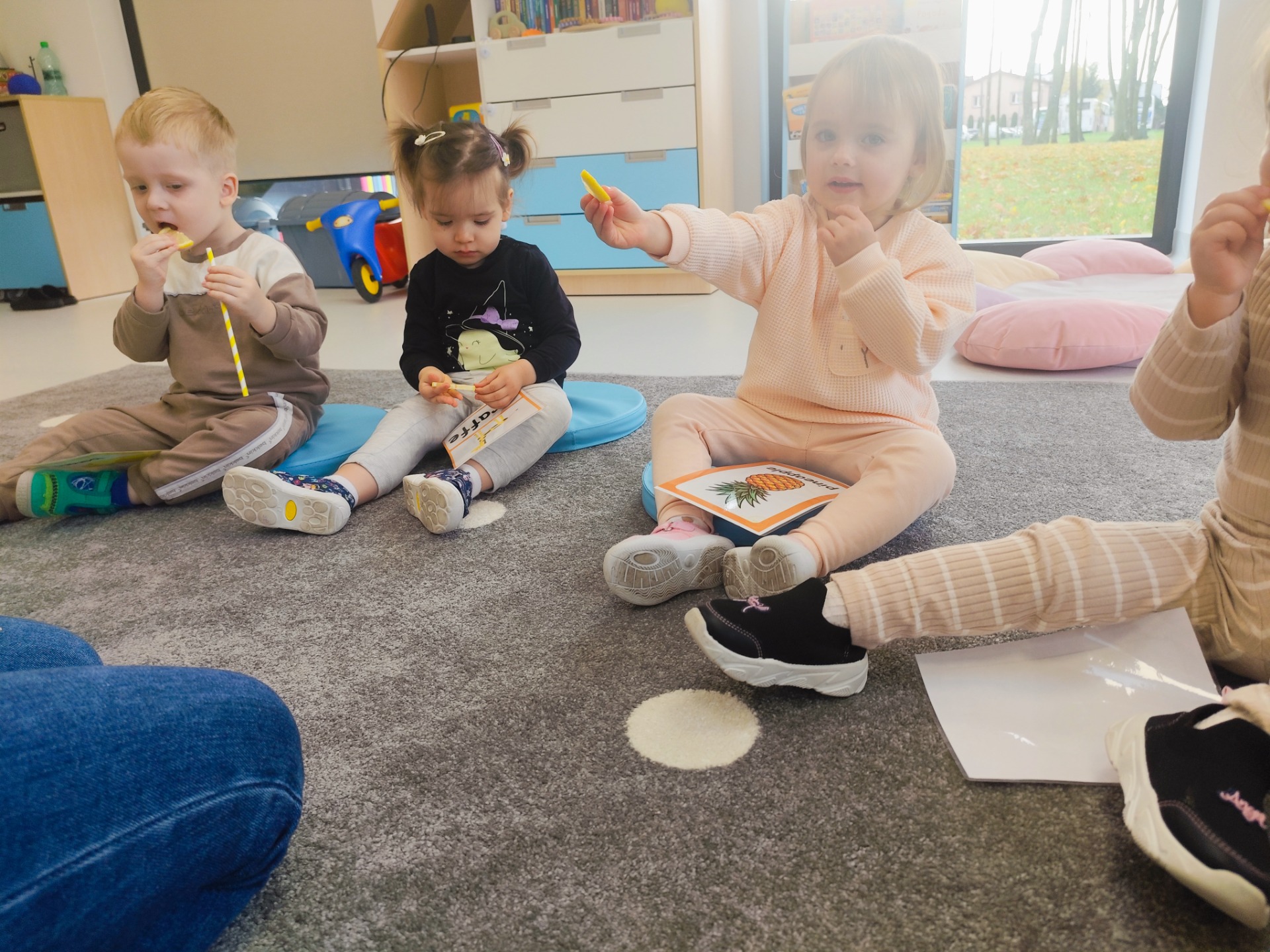 Na początku oglądały obrazki przedstawiające owoce w kolorze żółtym, takie jak banan🍌, cytryna🍋 czy ananas🍍.