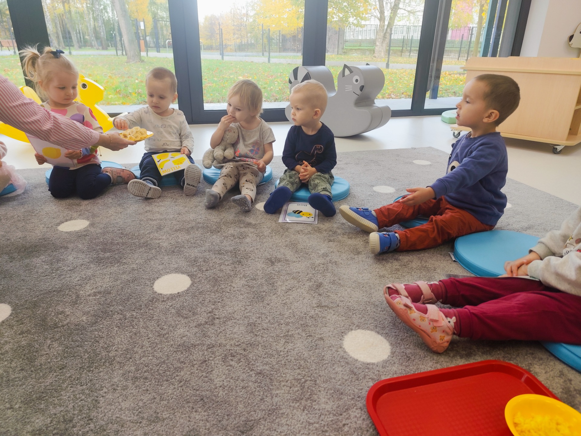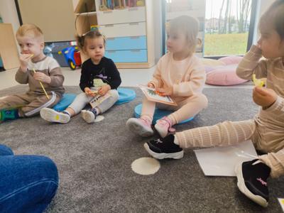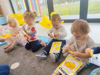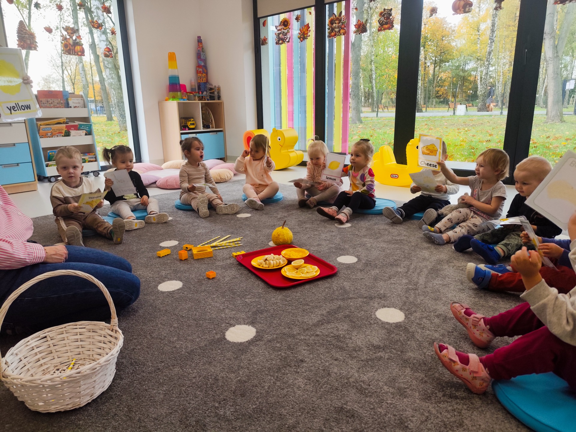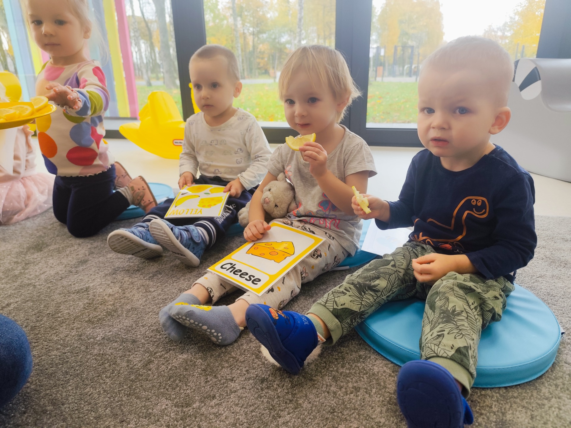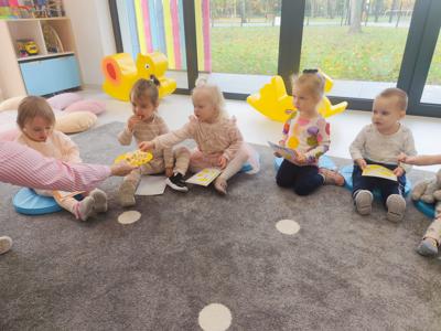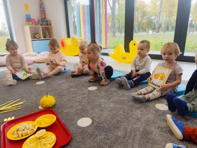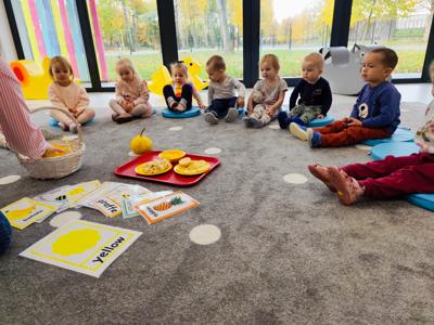 Zajęcia odbyły się w miłej atmosferze. Siedzieliśmy na dywanie w kole, oglądaliśmy obrazki i rozmawialiśmy o kolorze yellow.