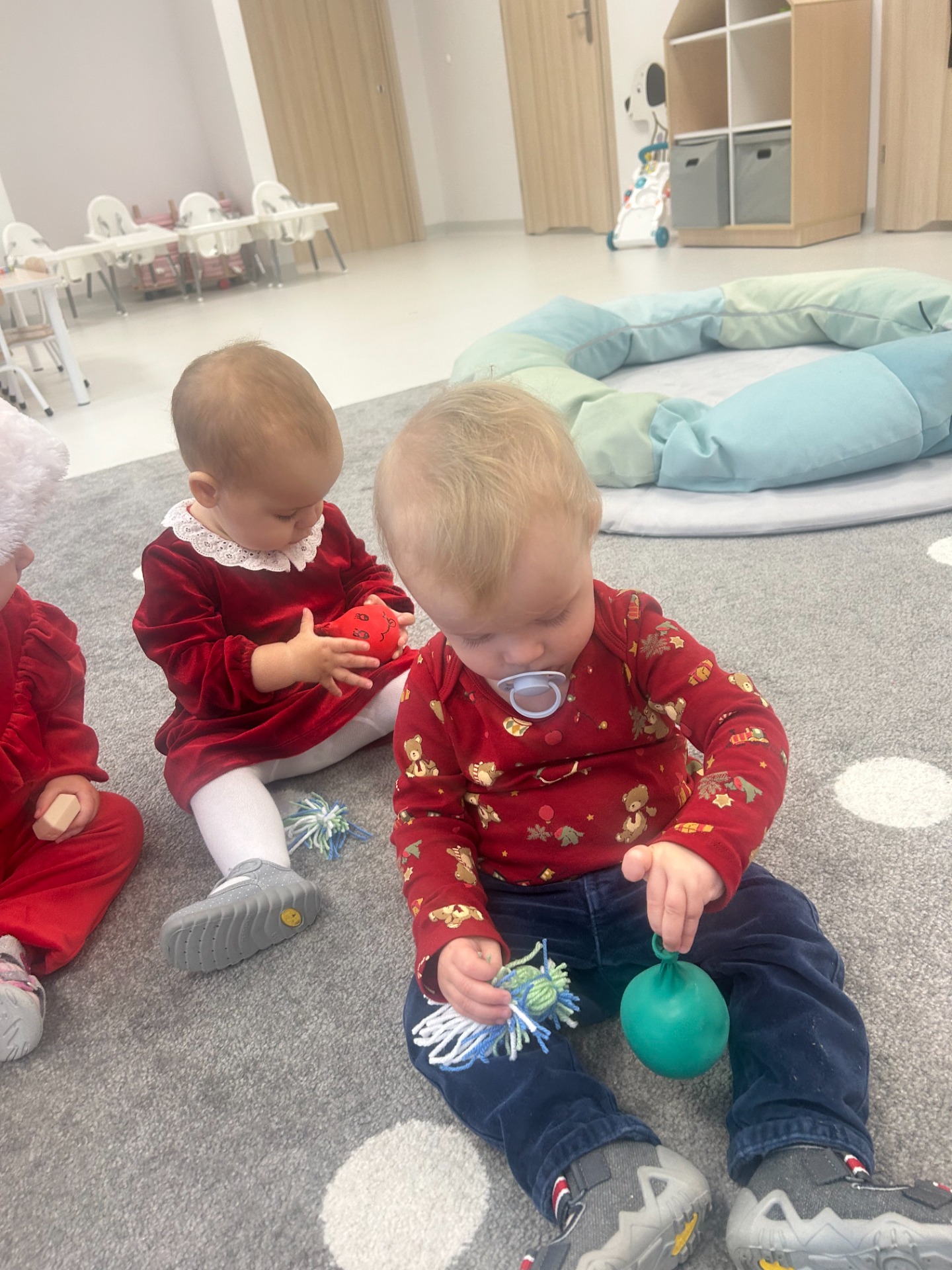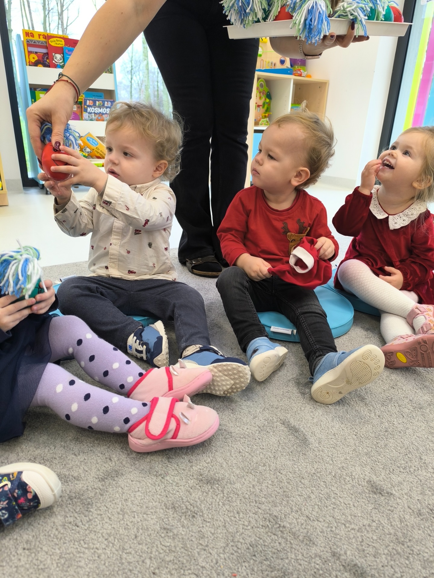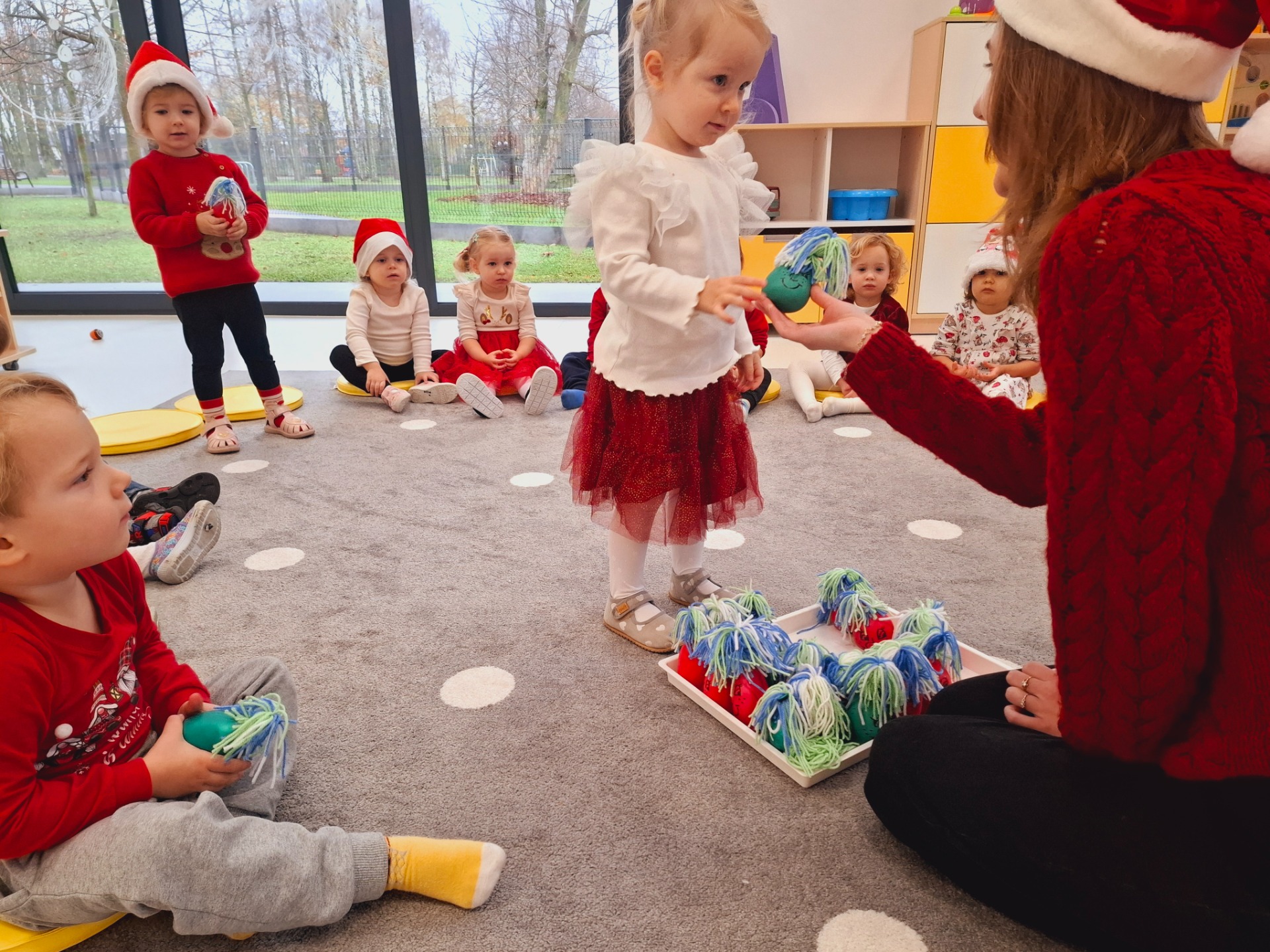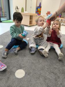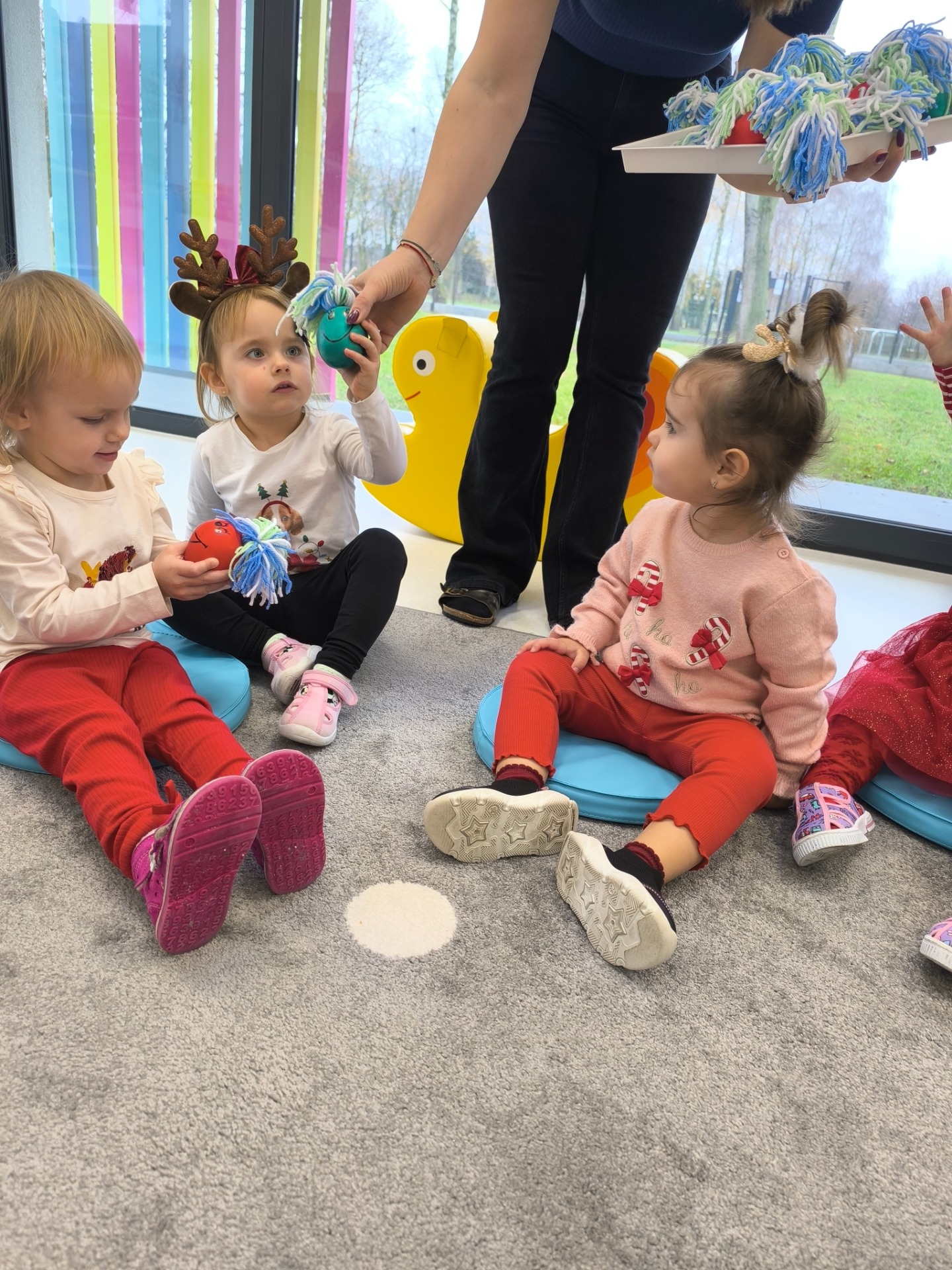 Choć dzieci nie brały udziału w tworzeniu, z wielkim zainteresowaniem obserwowały pracę cioć, dotykały włóczki, oglądały balony i czekały na swoje niespodzianki.