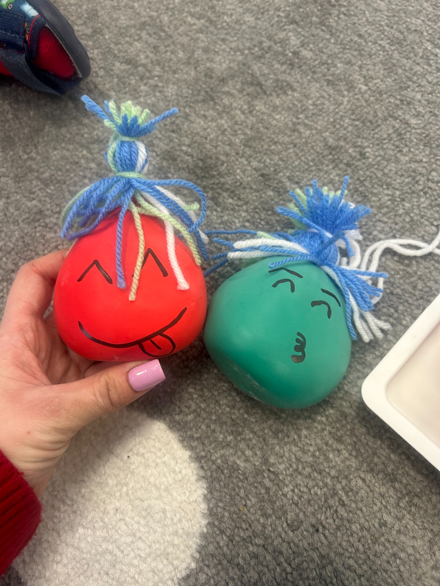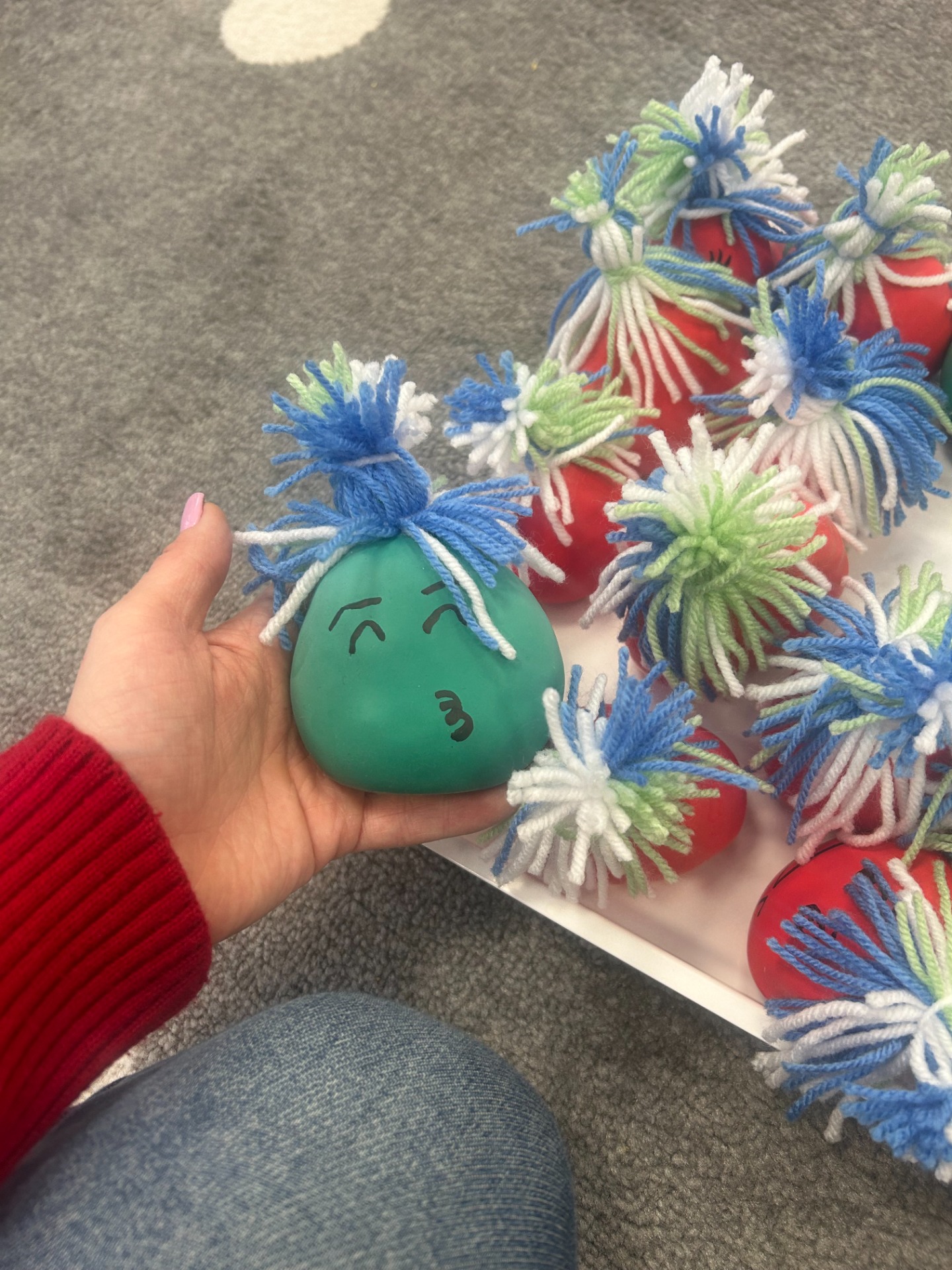 Każdy gniotek został zrobiony z ogromną starannością – balony zostały wypełnione, odpowiednio uformowane, a następnie ozdobione włóczkowymi „włosami”, które dodały im zabawnego charakteru.