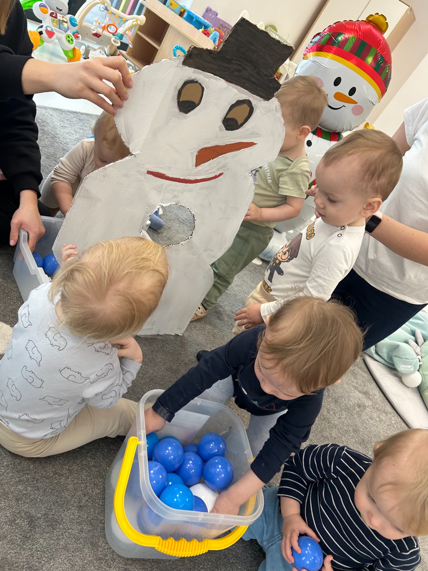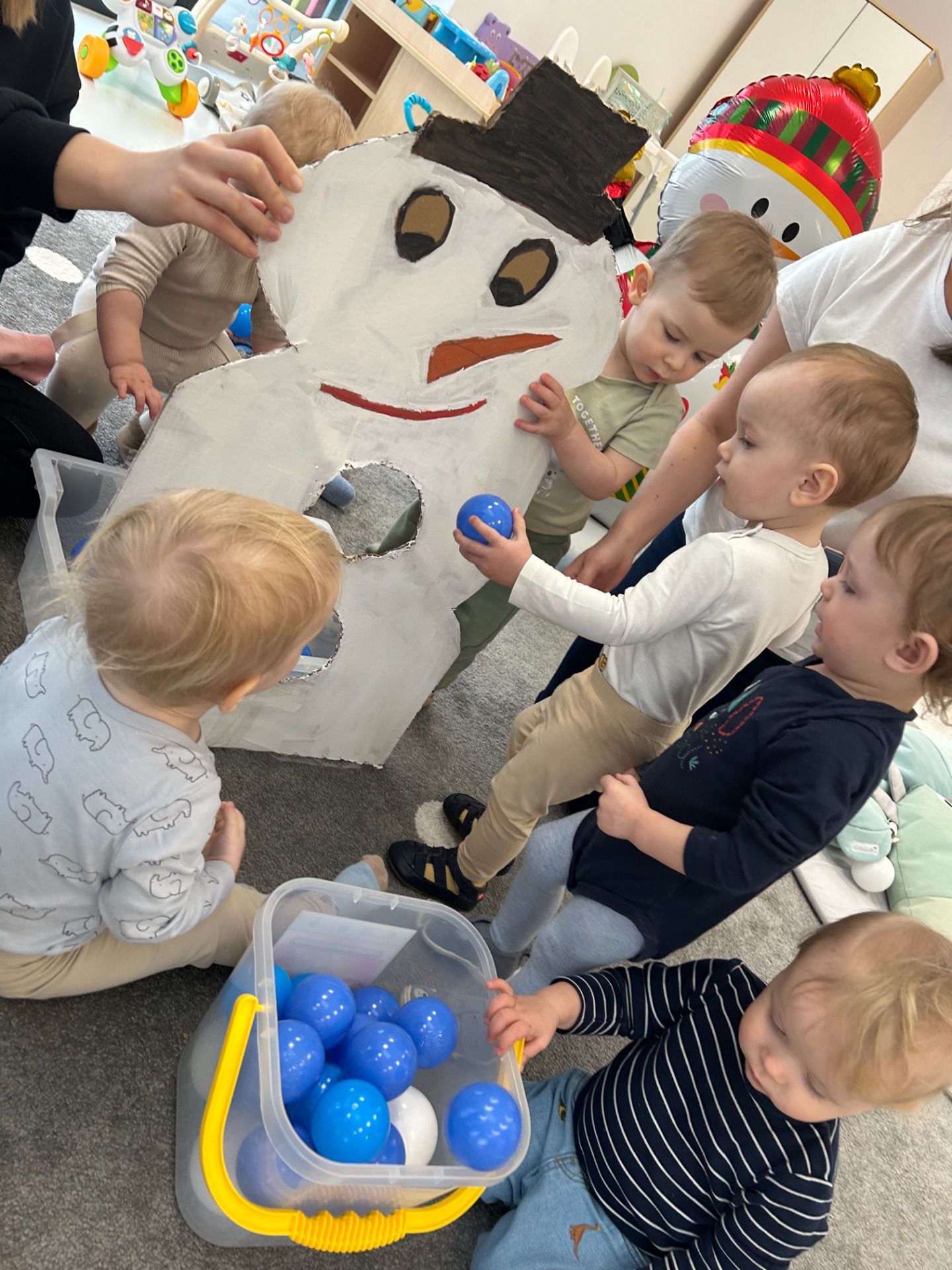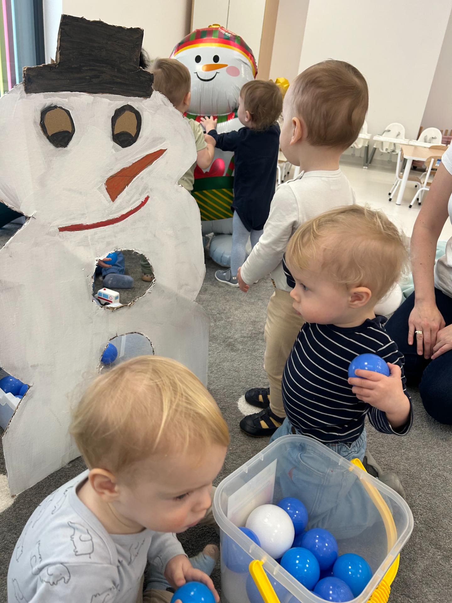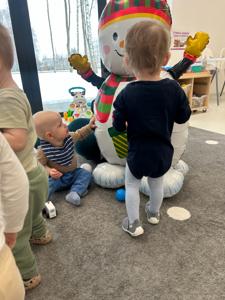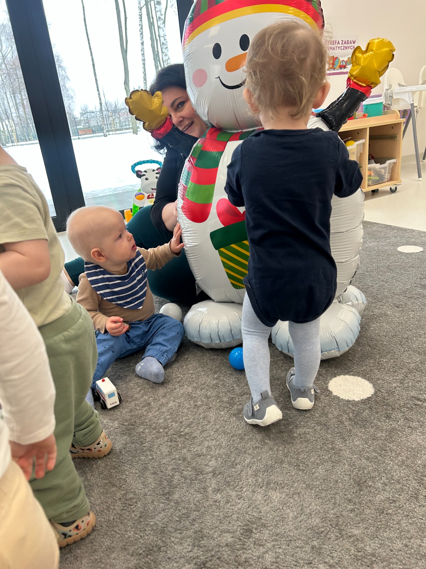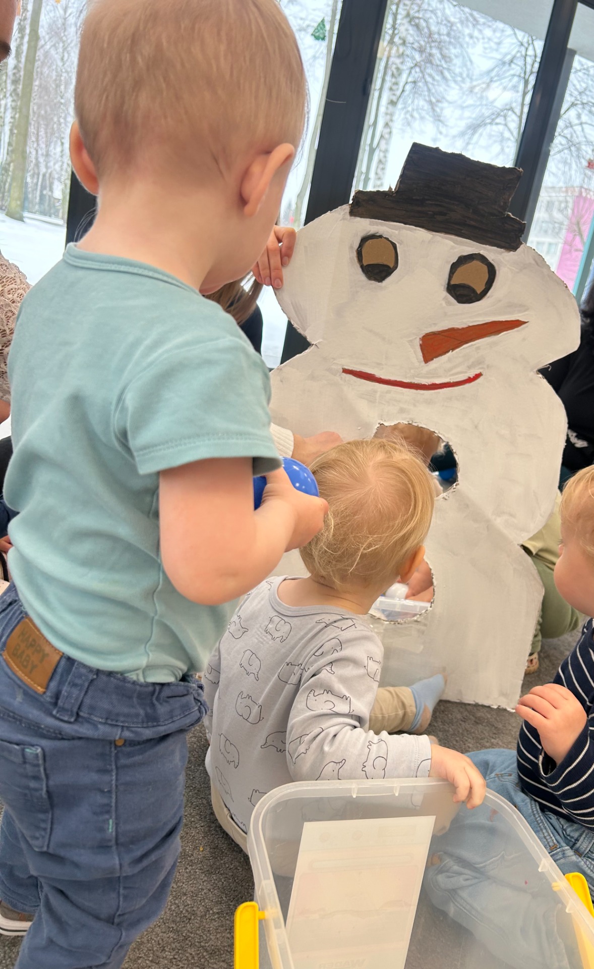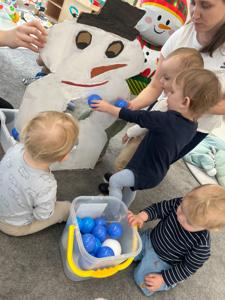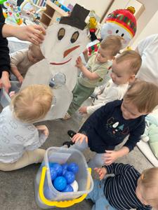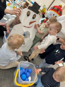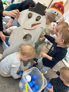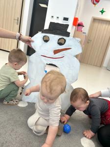 Maluchy z ciekawością oglądały dużą postać bałwanka, zaglądały do otworów, wkładały rączki i odkrywały, co się w nim kryje. ✋🖐️