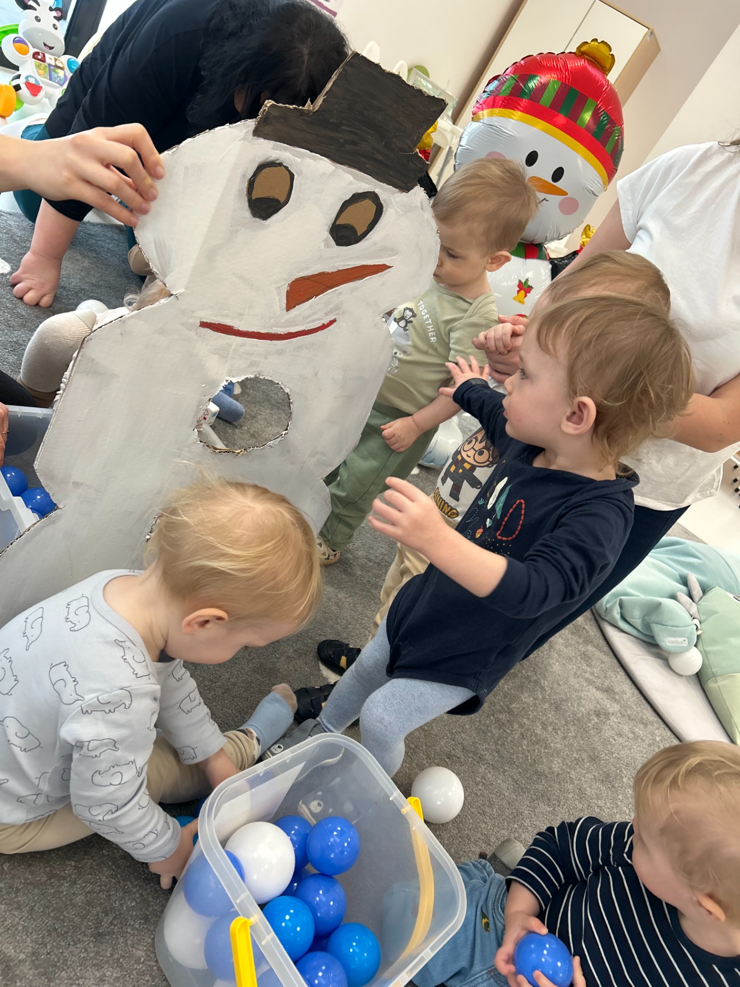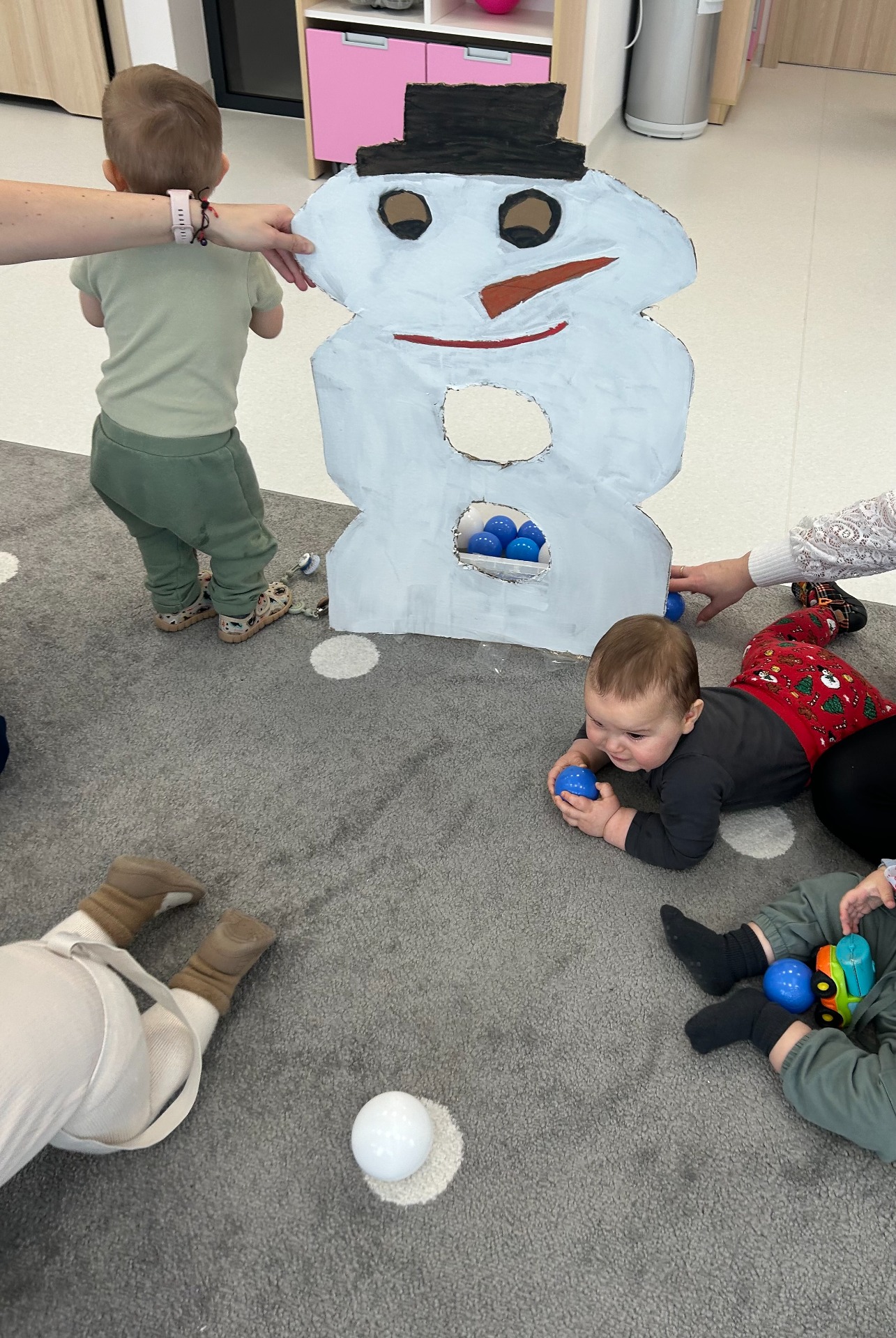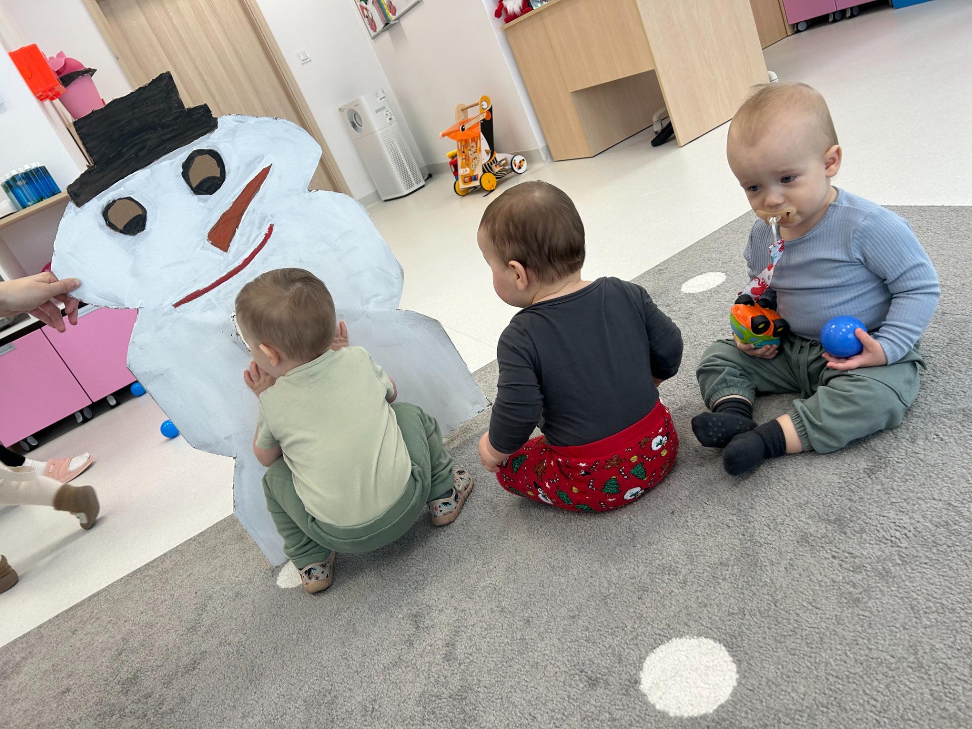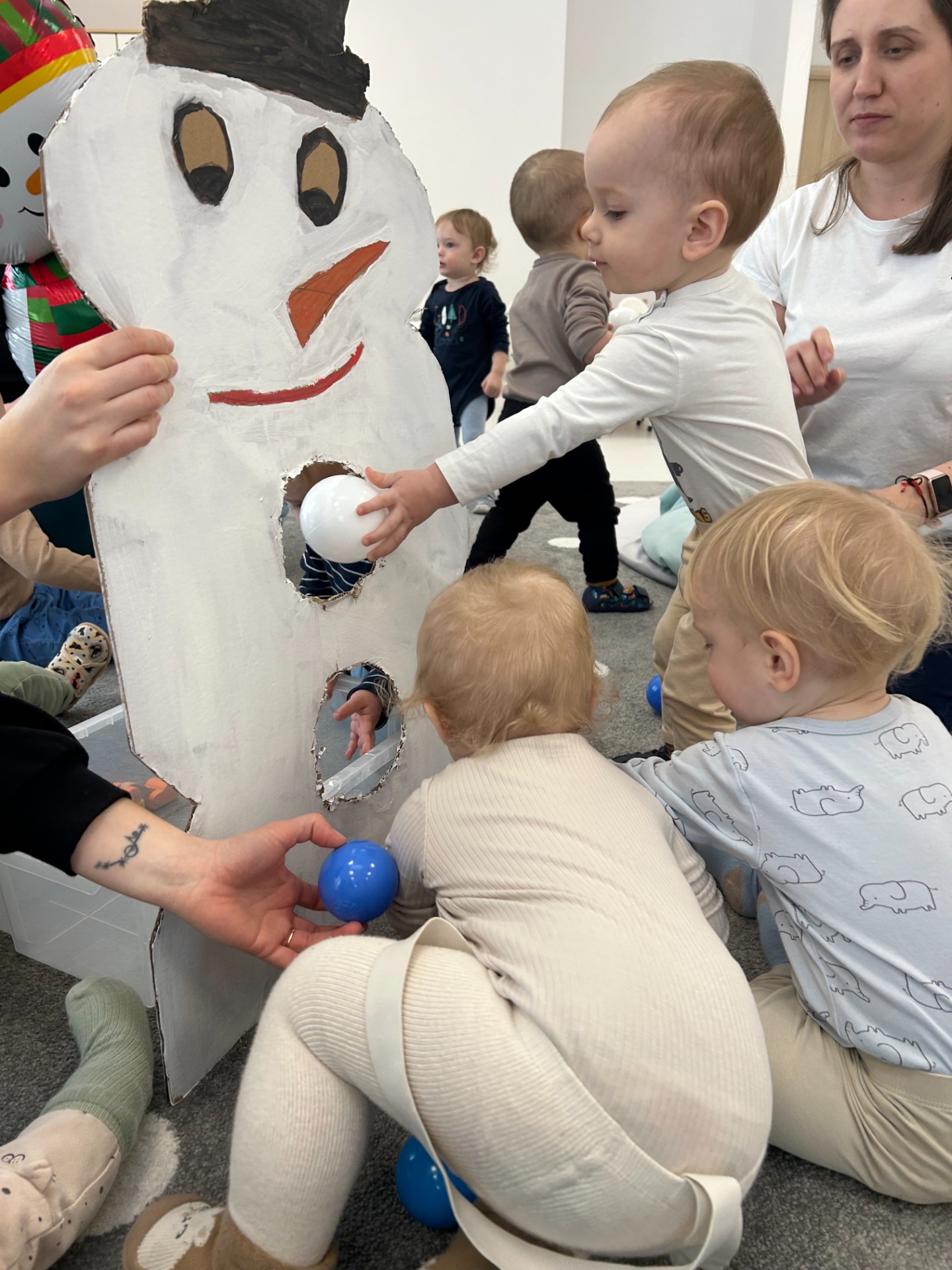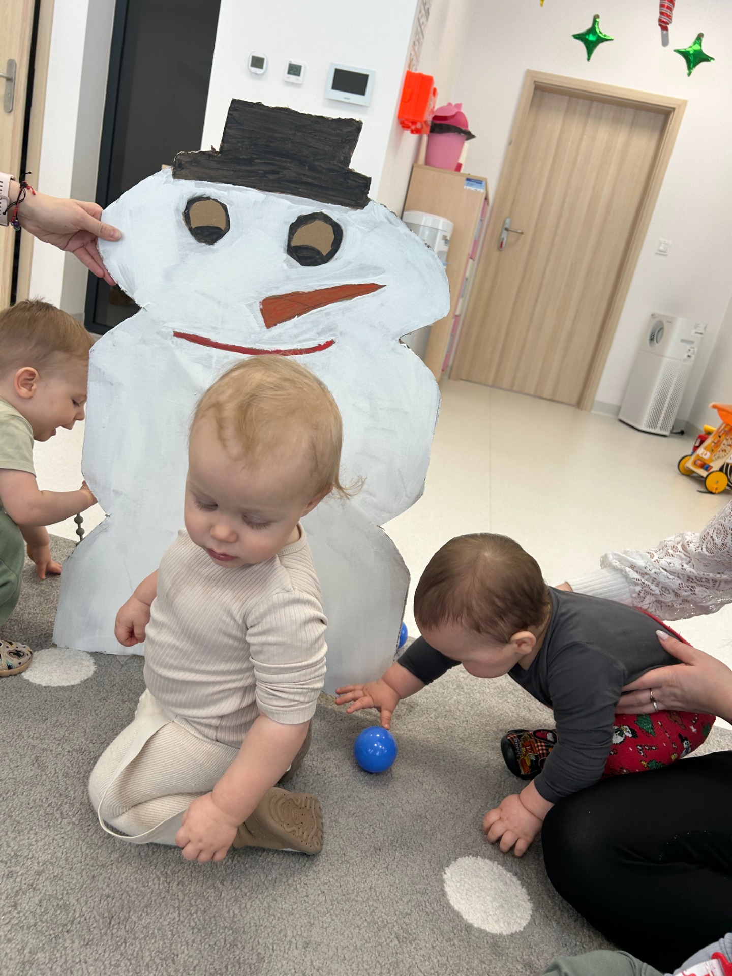 Maluchy z ciekawością oglądały dużą postać bałwanka, zaglądały do otworów, wkładały rączki i odkrywały, co się w nim kryje. ✋🖐️