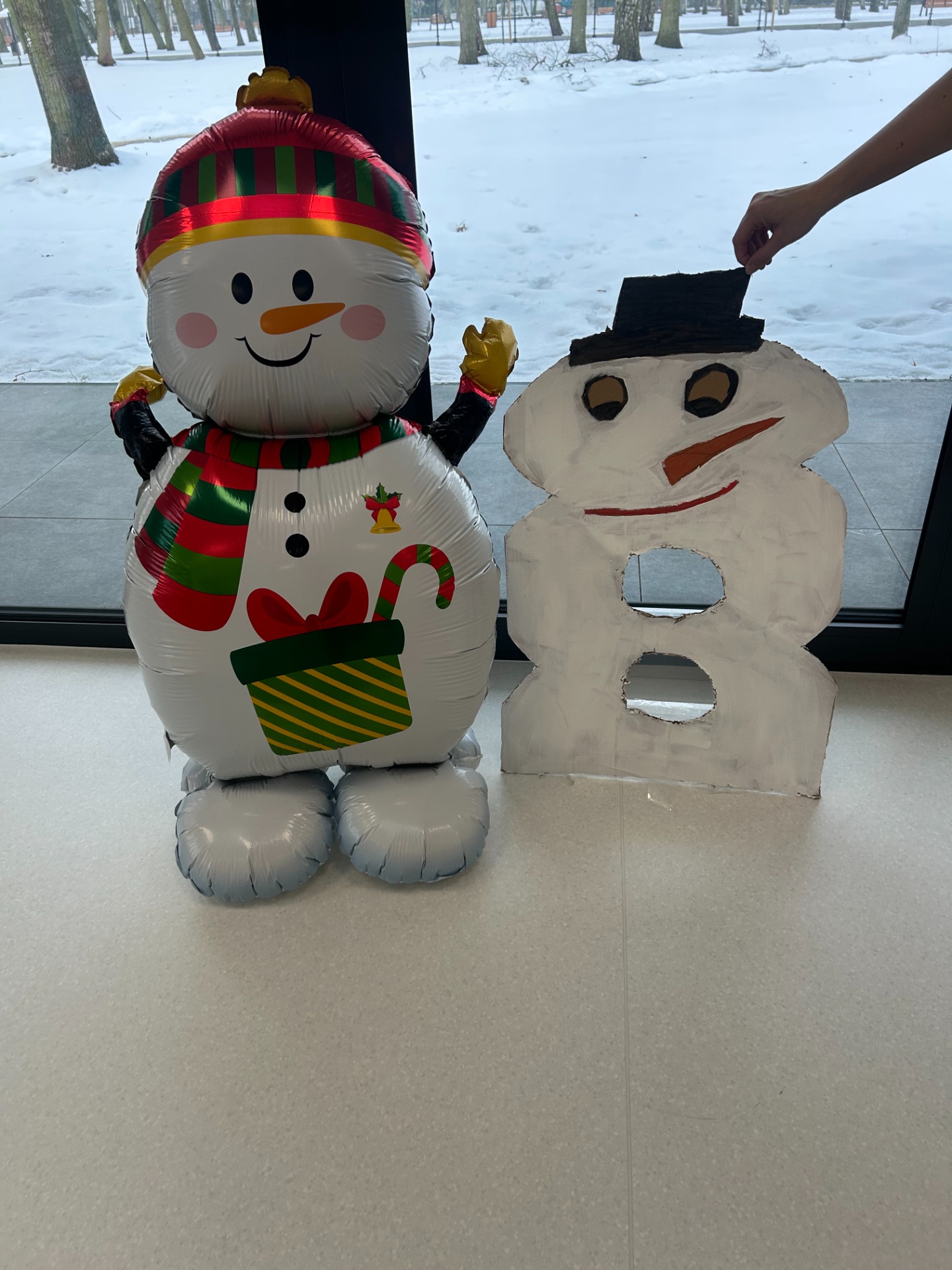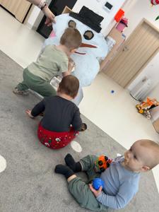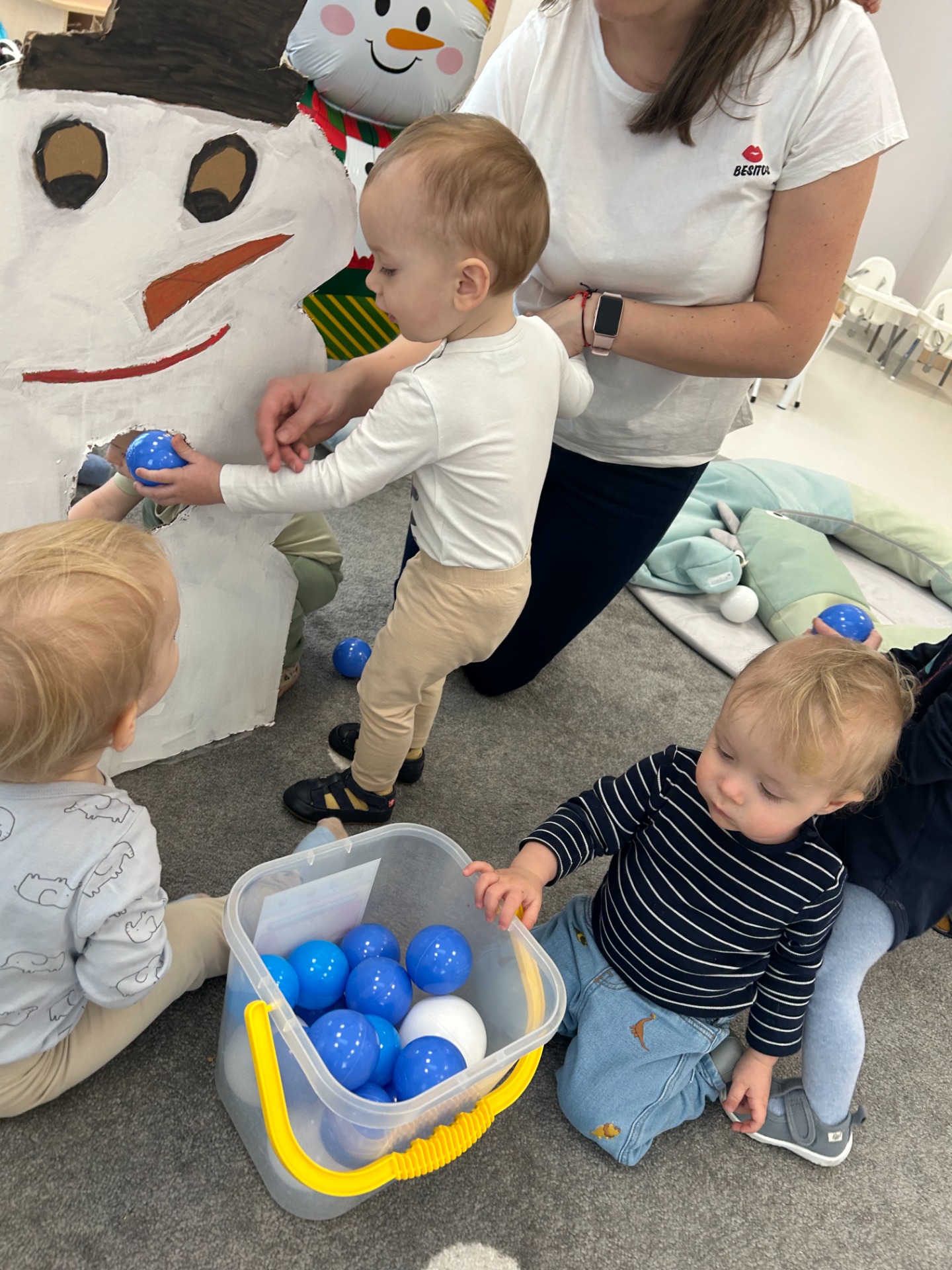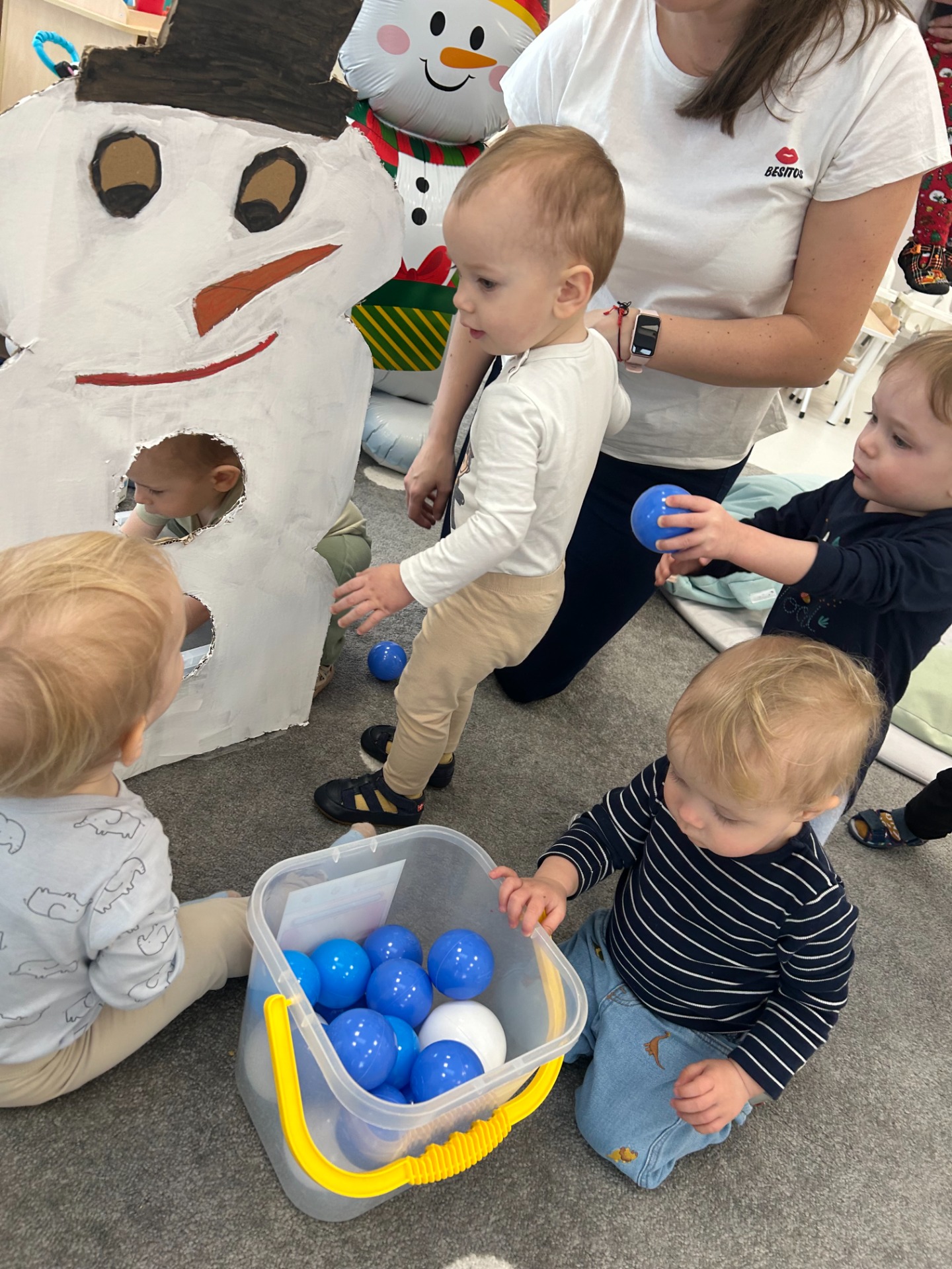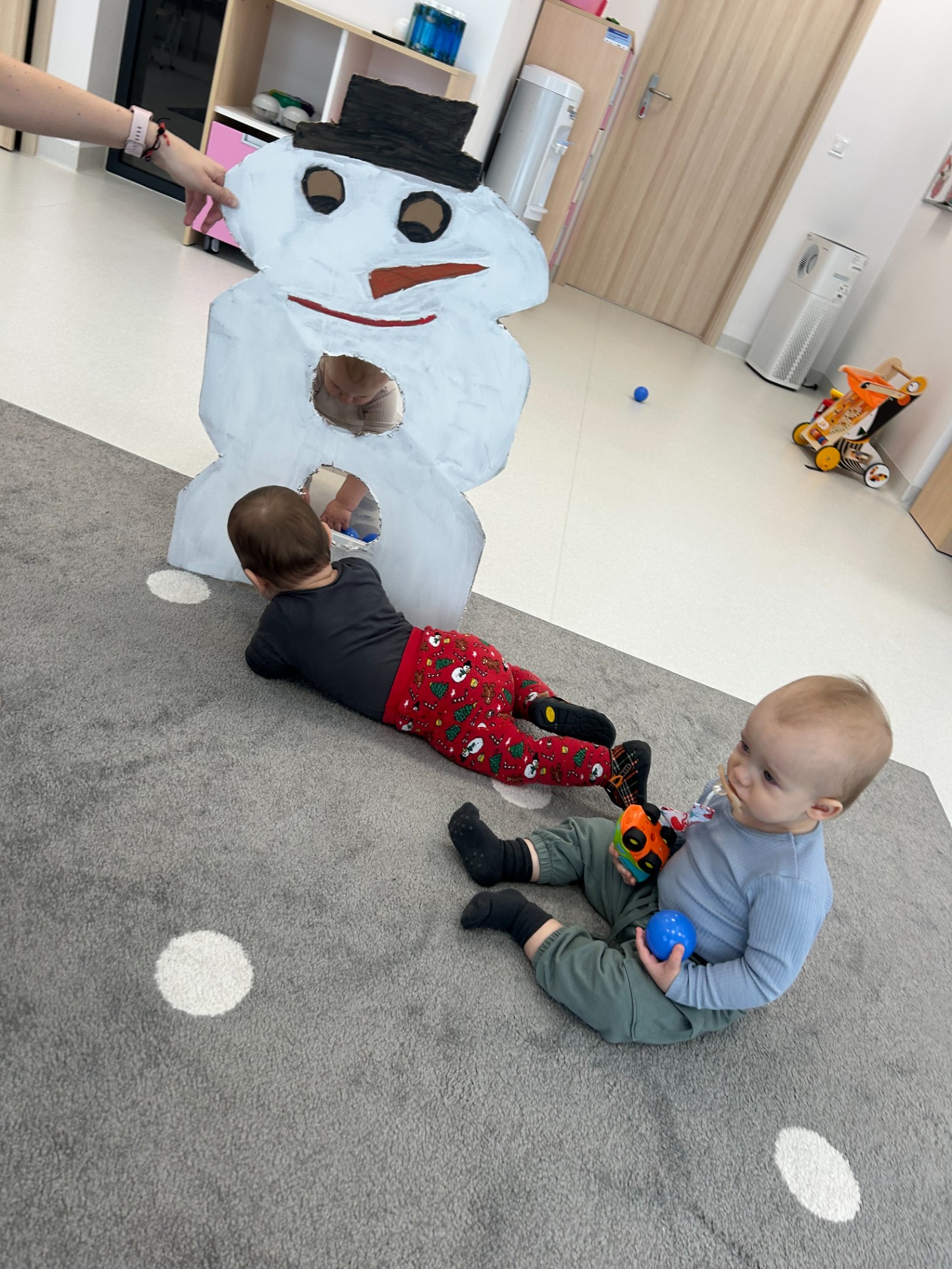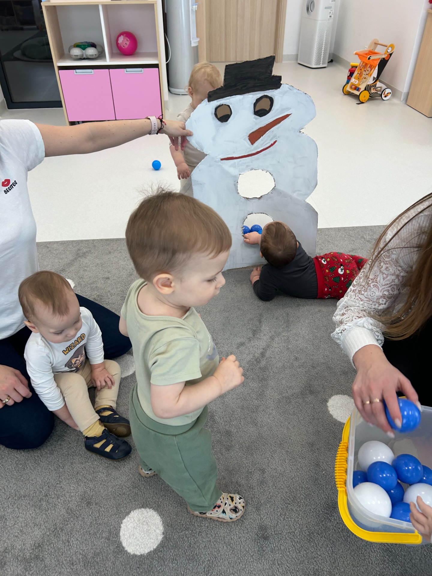 Maluchy z ciekawością oglądały dużą postać bałwanka, zaglądały do otworów, wkładały rączki i odkrywały, co się w nim kryje. ✋🖐️